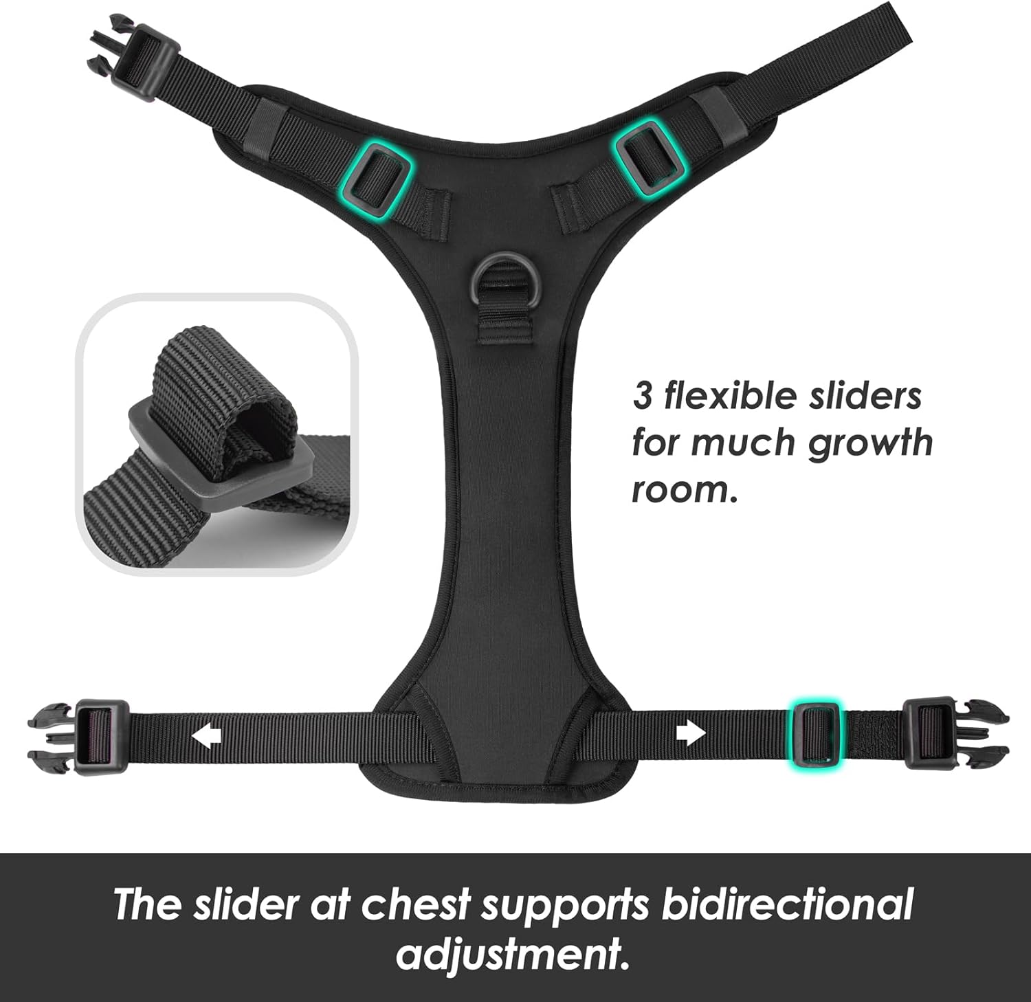 • Fully Adjustable: With its fully adjustable straps, our dog harness offers precise fitting for a perfect match to your dog's unique shape and size. The broad adjustment range not only accommodates different body types but also allows room for growth, ensuring long-term use and comfort.