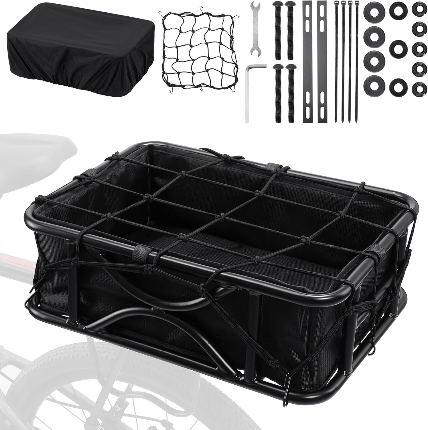 • High Capacity & Versatile: Bike cargo rack basket with large capacity (42x32x15cm) to carry groceries, small pets, and more. Includes an Oxford cloth liner bag, waterproof cover, and cargo net.