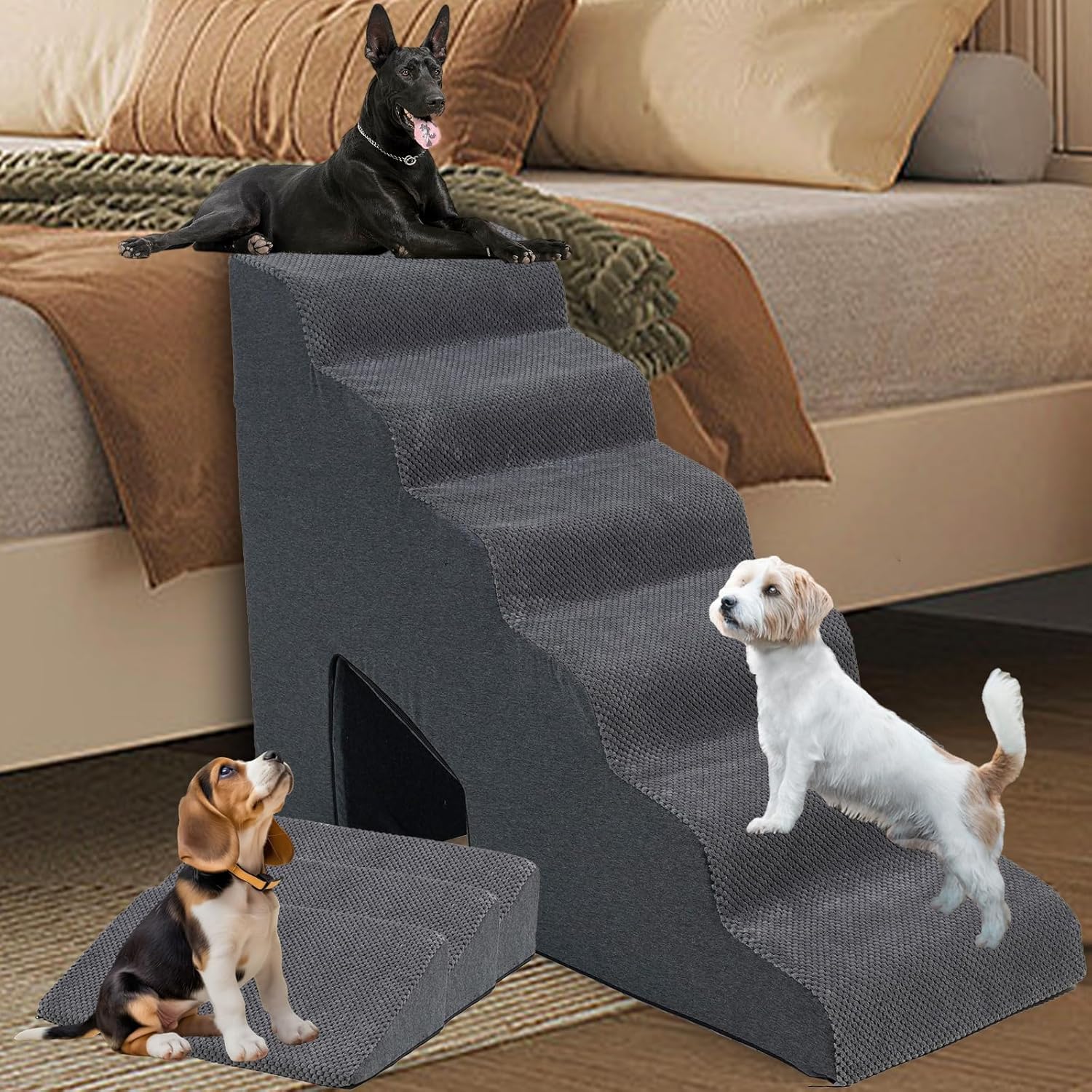 - [30inches" Height Bed Stair for Dogs and Cats]:The height of our steps is the highest on the market currently ,the size of the pet foam ramp is 41.5x15.7 x 30in, this pet step for small dogs helps access beds or couches of up to high bed ,high density memory foam makes it ideal for the small to medium breeds, and the silicone paw print on the bottom makes it more stable so the puppy can climb up and down without falling. We recommend the pet ladder for pets under 60 pounds.