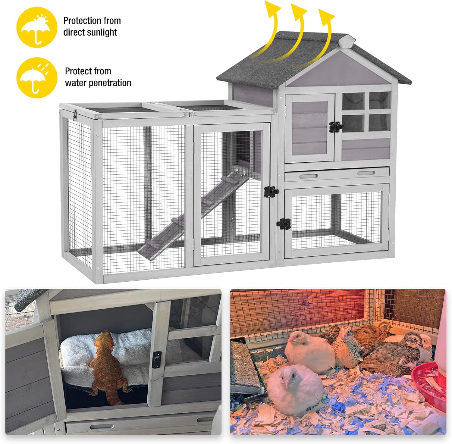 • 【Water Resistant Asphalt Roof & Cap】This rabbit cage features a durable,asphalt waterproof roof to protect your furry pet from the elements,and predator-resistant spring latch keeps your poultry safe.