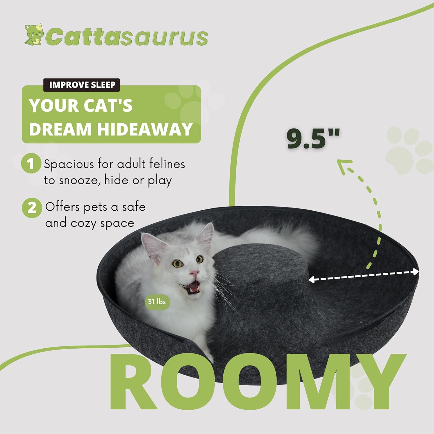 • Durable & Cat-Friendly Design: The Cattasaurus Peekaboo Cat Cave is made from non-toxic, odor-resistant felt that's built to last. It resists pilling and supports safe scratching - perfect as a cat tunnel bed, cat bed cave, or cat scratcher bed. Ideal for all seasons, it offers a snug cat donut bed up top and a comfy cat tunnel below.