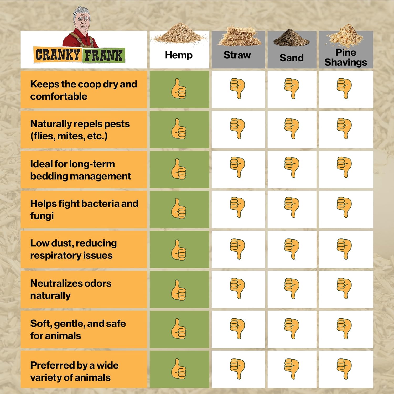 • Hypoallergenic & Eco-Friendly Bedding: Safe for all animals and pets, Cranky Frank hemp bedding is hypoallergenic and carbon-friendly, sourced from hemp, the crop that absorbs the most CO₂ on Earth. Better for your animals, better for the planet.