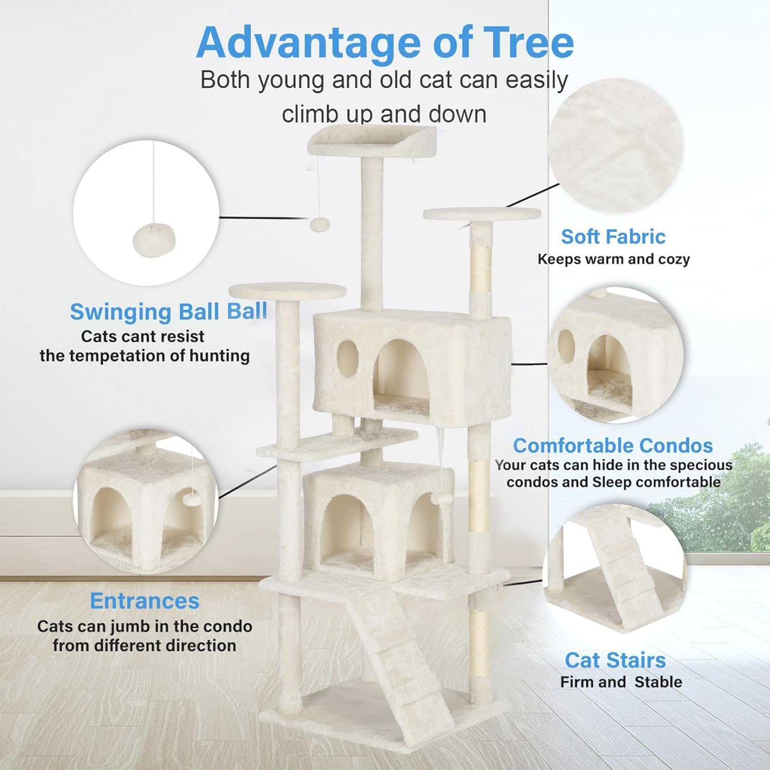 FDW Cat Tree Tower 62in Multi-Level Durable Cat Scratching Post & Cozy Fun Jumping Platform Space Saving Condo Pet Play House for Indoor Cats, Beige