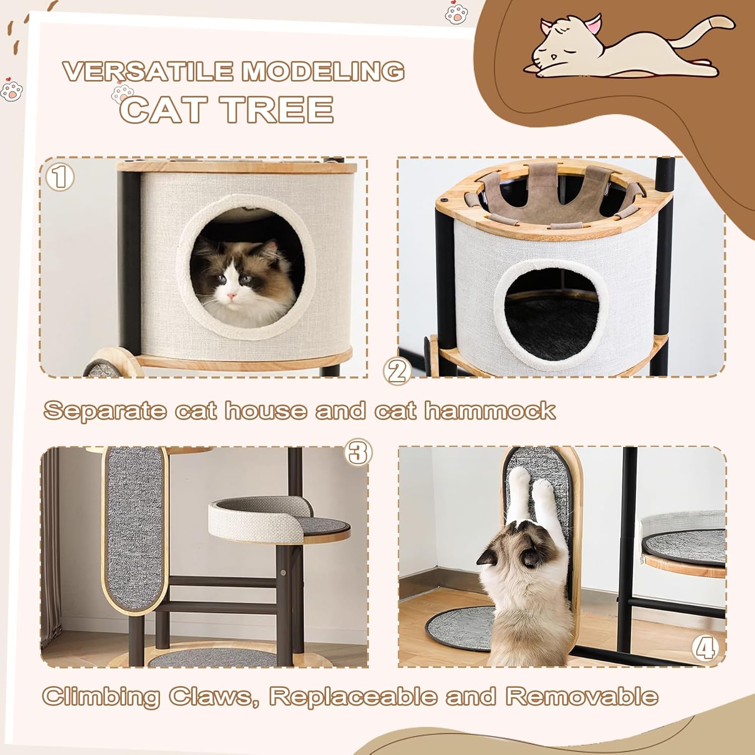 • 【ALL-IN-ONE CAT PLAYGROUND】Featuring a multi-level design for scampering up and down, the cat tower is equipped with perches, cat house, hammock, and scratching post, which increases the activity space for cats, promotes their exercise and vitality, and satisfies their climbing instinct and curiosity.
