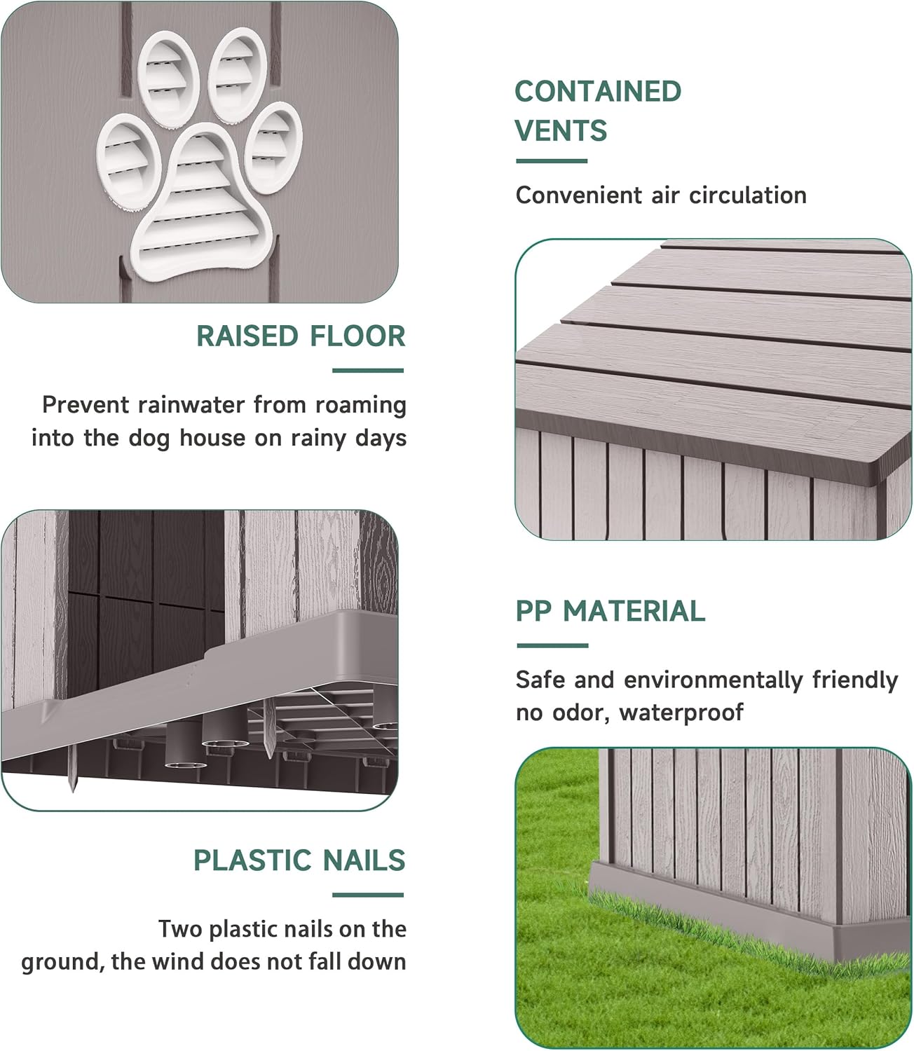 • Strong and Stable: To ensure that the dog house is stable and reliable, we have equipped it with three plastic nails. These pegs can firmly fix the dog house on the grass, preventing it from moving easily due to your dog's activities or external factors such as wind.