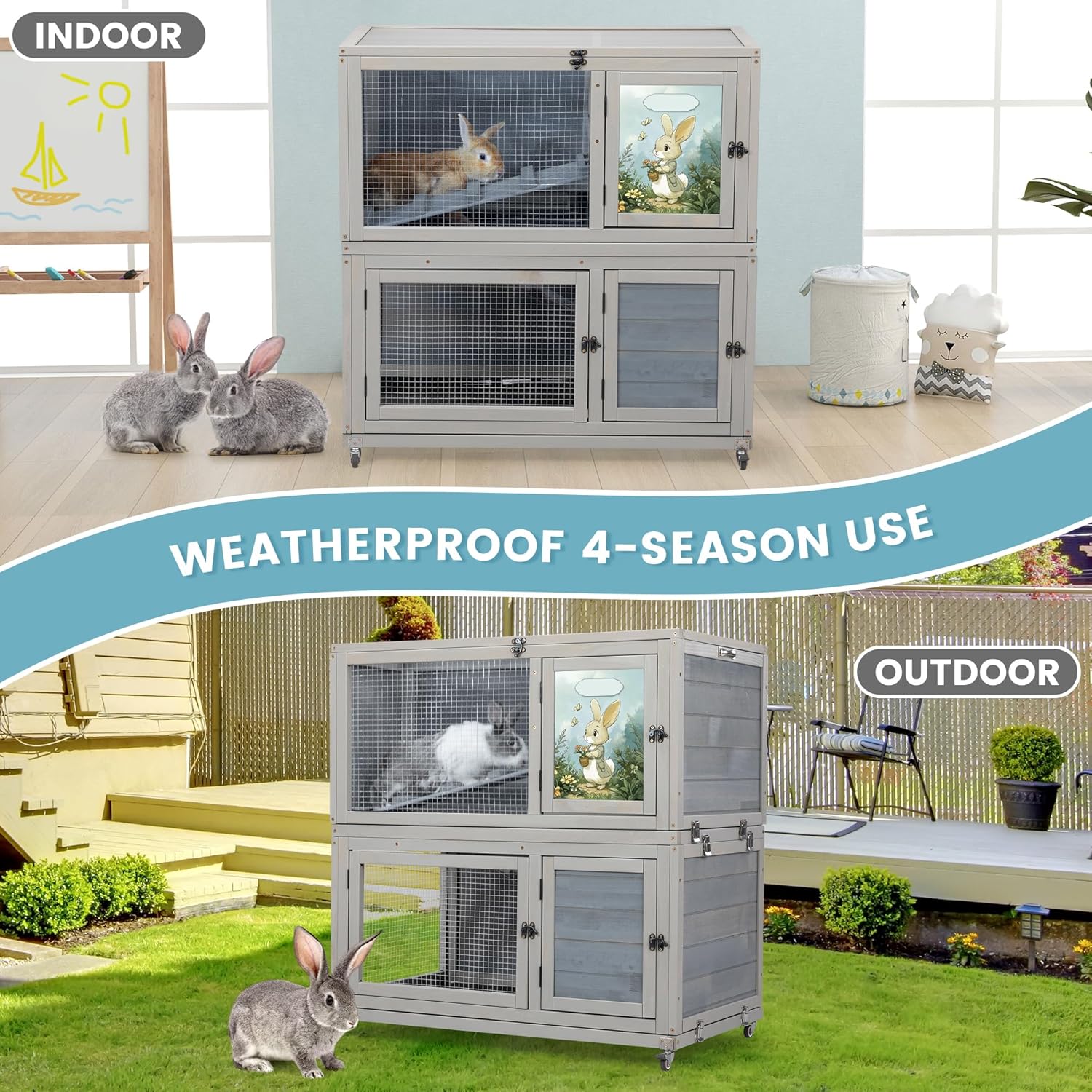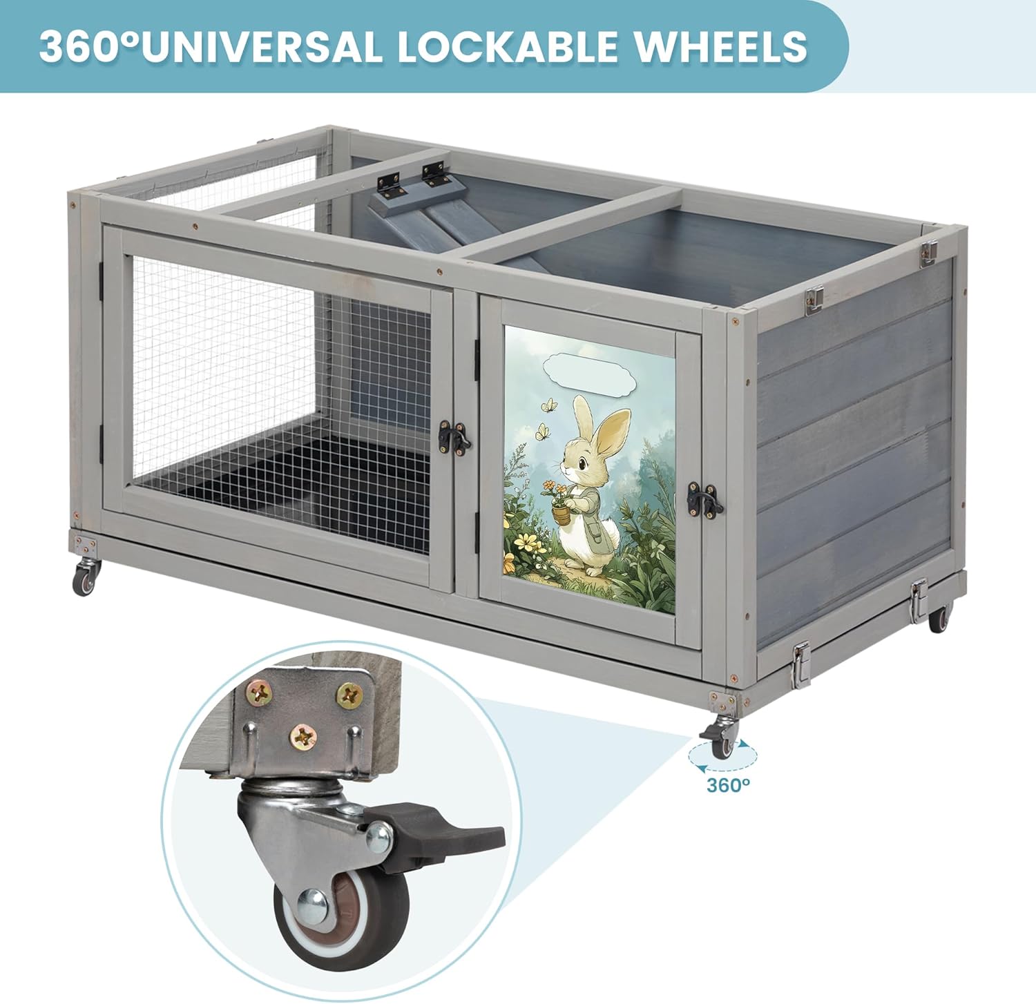 • 【Excellent Mobility】Equipped with 4 swivel wheels, this luxurious two-story Small Animal Home can be easily moved to the garden, lawn, or backyard—wherever your pet loves to be. 2 wheels feature brakes to ensure secure stopping and stable daily use.