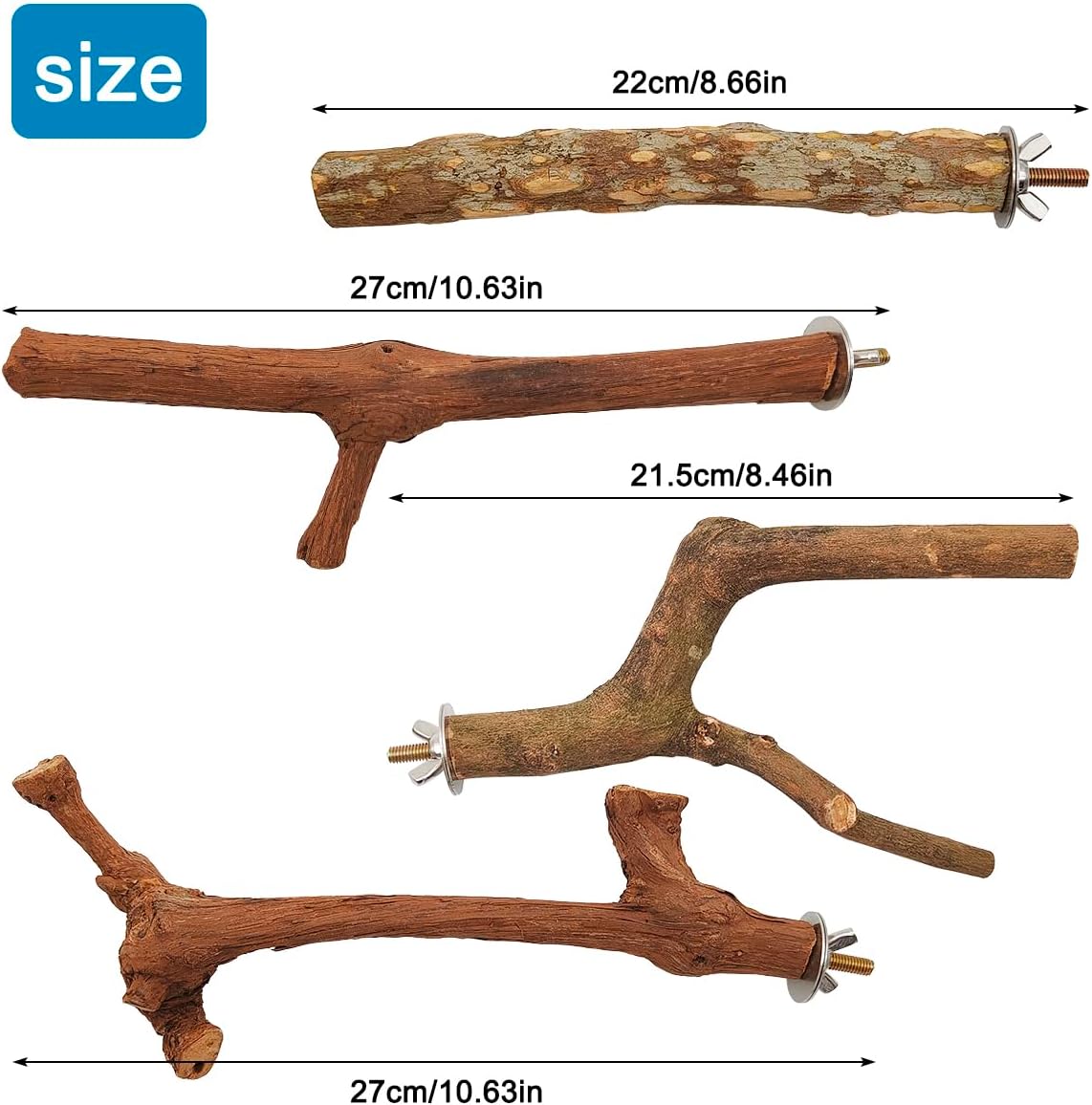 • 3 bird perches: You will receive 4 Pcs of 3 styles bird stands. The grape wood stick is about 9.7-10 inch long, with a diameter of about 0.7-1.1 inch at the bottom. The fork standing branch is about 7.8-8 inch long, and the wooden stand is about 7.8 inch long.