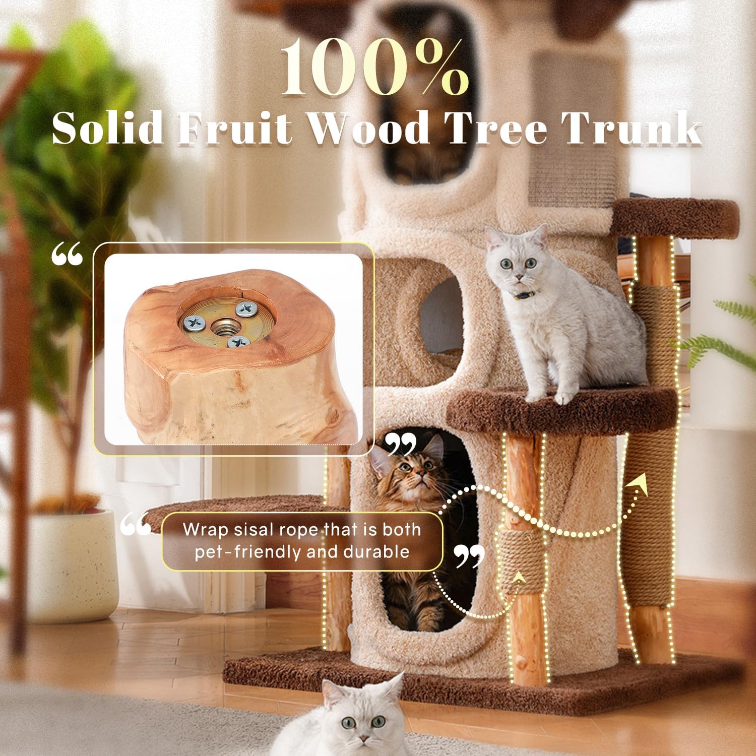 • 【Pet-friendly Material】The cat tree features hand-picked and polished branches of natural fruit wood with unique wood grain patterns. Each piece is a unique, custom-made creation. The trunk is wrapped with hand-spun natural jute, providing an ideal surface for cats to maintain their claws. This cat tower offers a healthy environment for your feline friend.