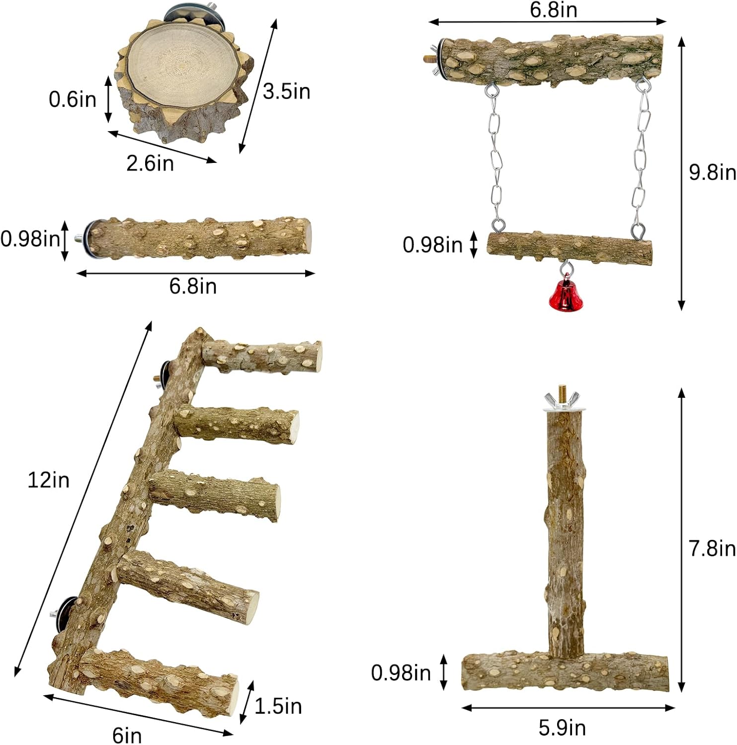 • 6Pack Bird Ladder Perches: Package includes Bird ladder X 1, T Shaped Perch X 1, O Shaped Paltform X 1, Wooden Perch X 2, Bird Swing X1. Design a natural bird habitat with varied perches to support daily rest, play, and instinctive behaviors