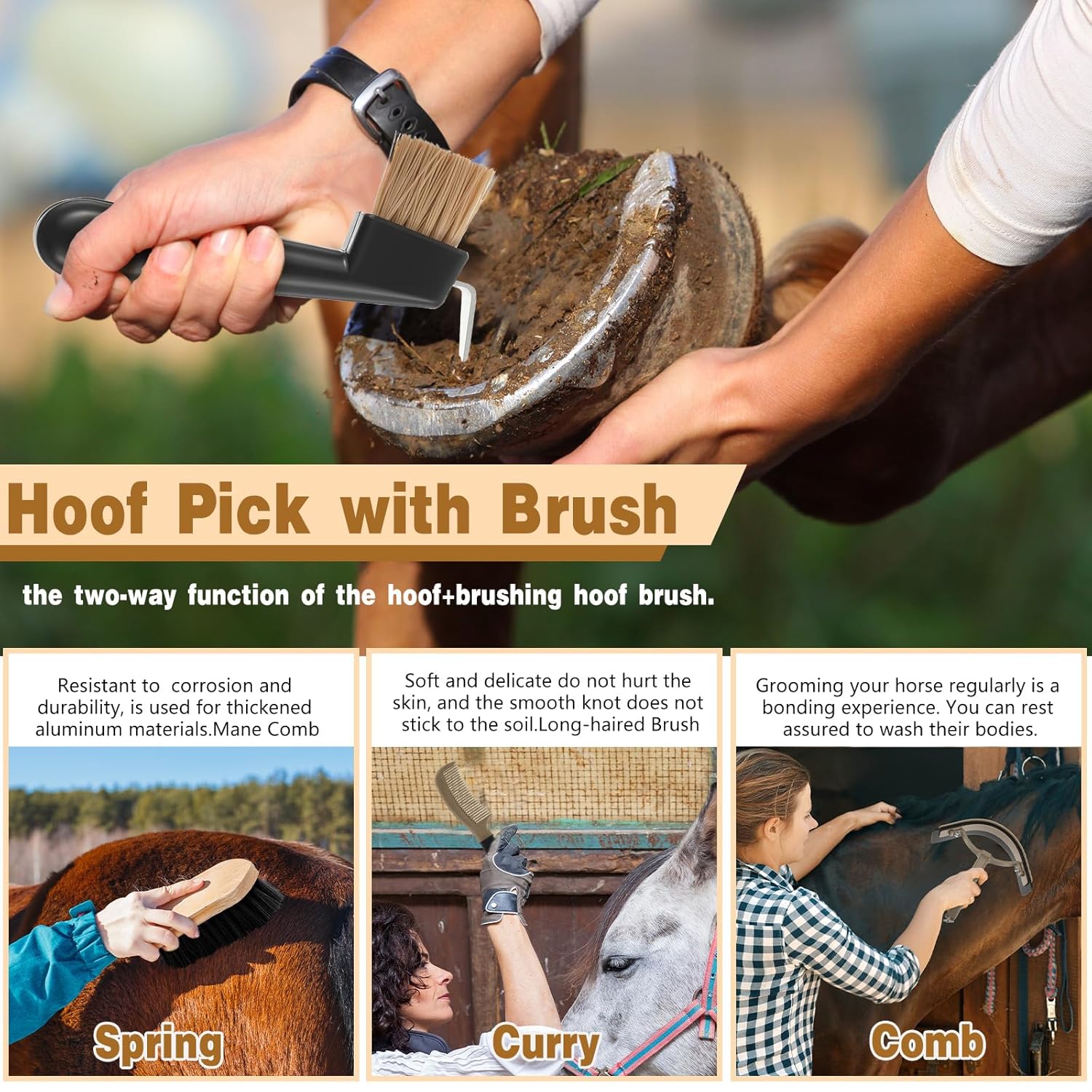 • Horse Grooming Kit: this horse grooming set includes great storage bag, oval massage brush, hard brush, soft brush, sweat scraper, bath sponge, hoof pick with brush, mane comb, tail comb, rubber band, etc., a total of 12 pieces, such a nice and complete grooming set can satisfy your needs for grooming your horse