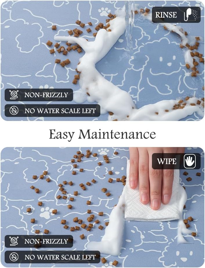 • Keep Clean & No Stains:No marks will be left when food and water are dropped on the dog food mat. Unlike traditional silicone pet feeding mats, our pet feeding mat for food and water won't pick up pet hair or dust, and won't build up tough-to-clean limescale, keeping the dog bowl mat as good as new forever.