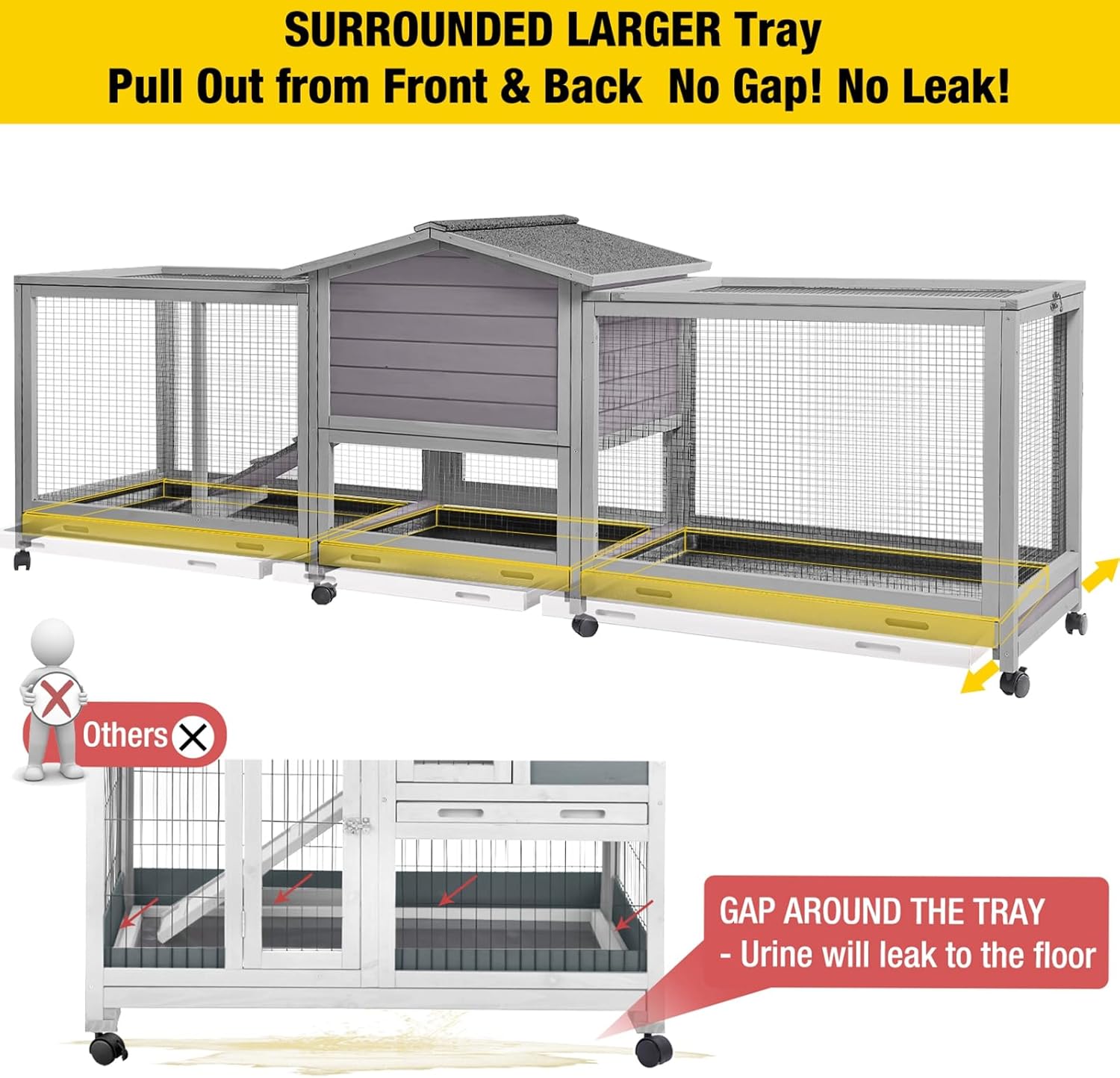 • 【Leakproof Tray】The rabbit cage comes with 4 pull-out tray,the tray is made of high quality plastic,anti-odour and easy to clean,sturdy and durable,the tray will not leak or rust!The trays can be pulled out from the front or back.