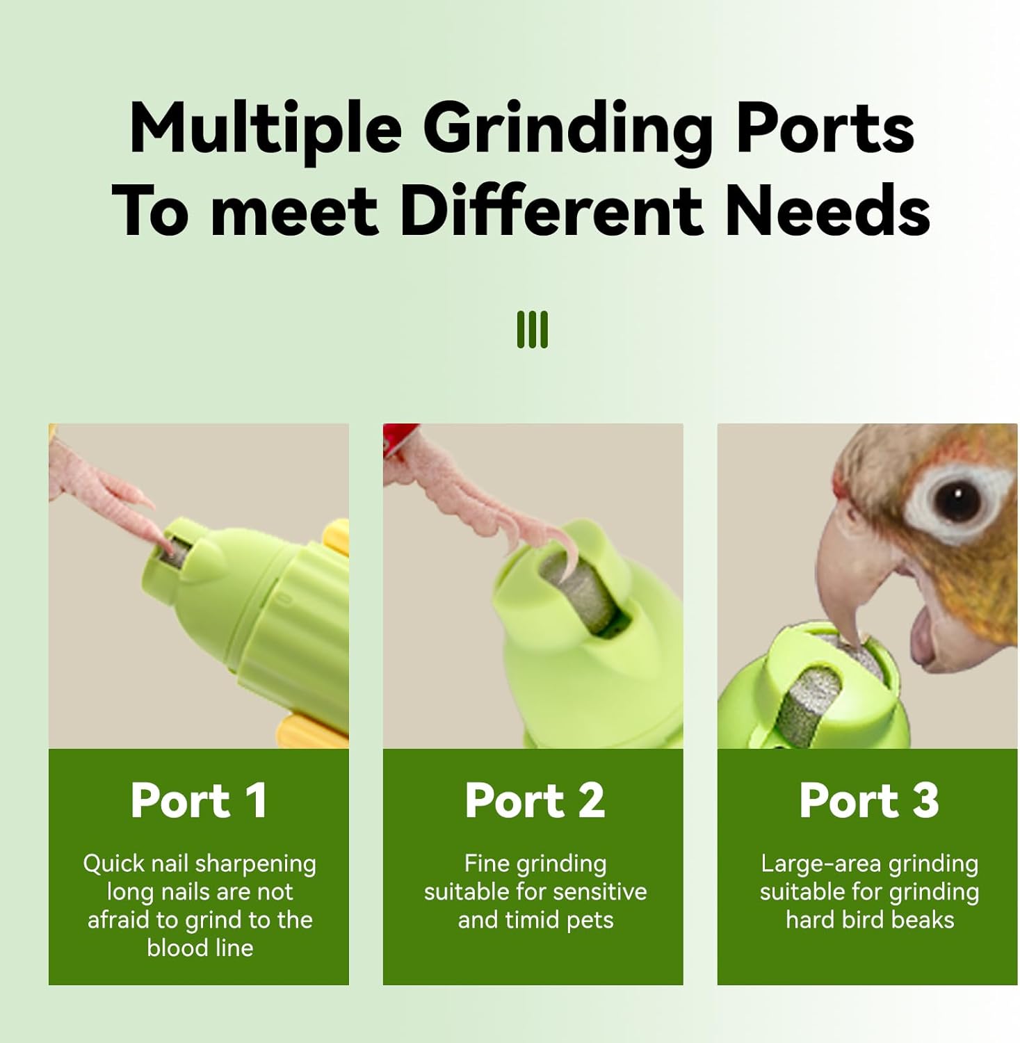• 2-Speed Parrot Nail Grinder with 3 Grinding Ports & Diamond Roller Bit –— This bird nail grinder advanced dual-speed switch and three interchangeable ports tackle everything from delicate parrot claws to tougher beaks, while the premium diamond roller bit ensures fast, precise trimming for birds of all sizes