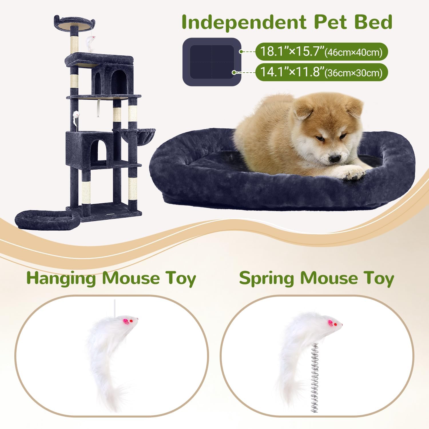 • BONUS INDEPENDENT PET BED- Featuring a separate pet bed(17.7"x 13.4") that is not only suitable for cats but can also be used independently. it can be placed under the cat tower or in your cat's favorite spot. It is also suitable for multi-pet households, allowing other pets to enjoy its benefits