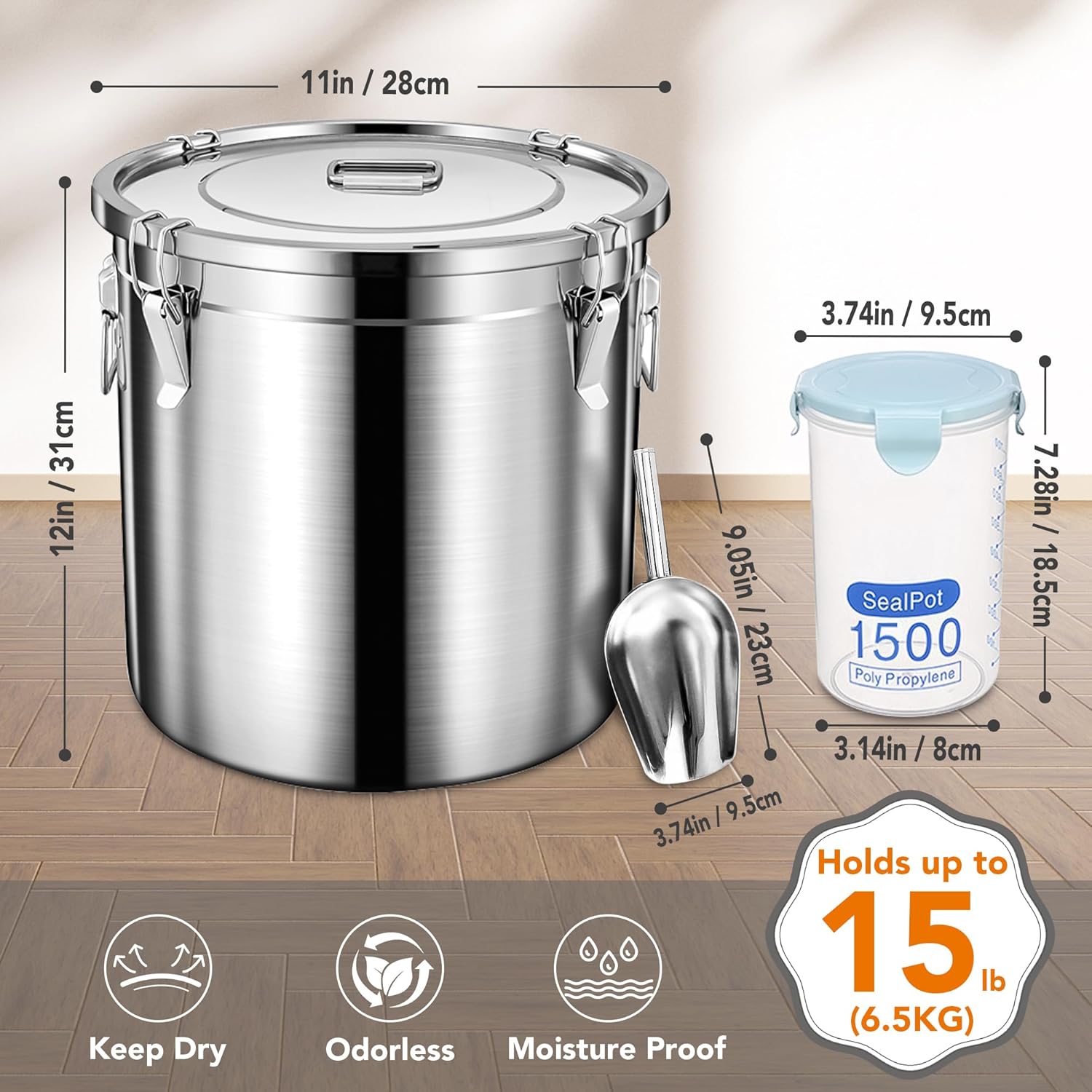 • Stainless Steel with Sealed Lid Material: Our dog food storage containers is made of stainless steel, which is more durable than ordinary plastic food storage buckets. The dog food storage containers with a lid can maximize the original freshness of food