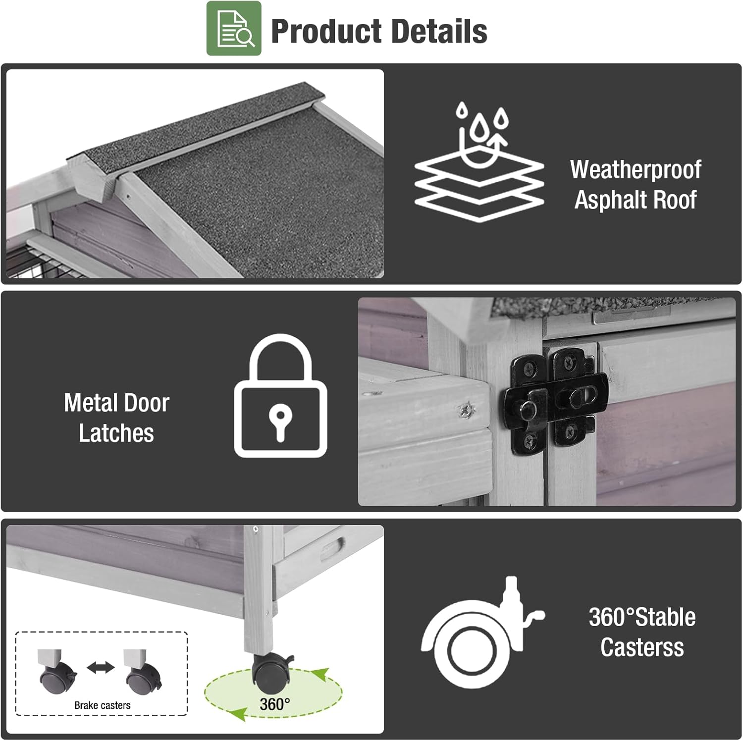 • Mobility and Convenience: The bunny hutch is equipped with four wheels that provide exceptional mobility. Easily move the hutch around your yard or inside your home. Each wheel comes with a locking mechanism that allows you to secure the hutch in place when needed.