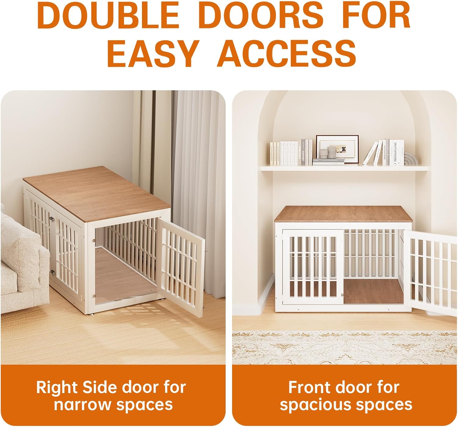 • 【Double Doors Design】The dog kennel furniture has a front door and a side door, your pet will go in and out easily with double doors. The double-doors design can adapt to more different space environments. You can decide whether to open the front door or the side door according to your needs.