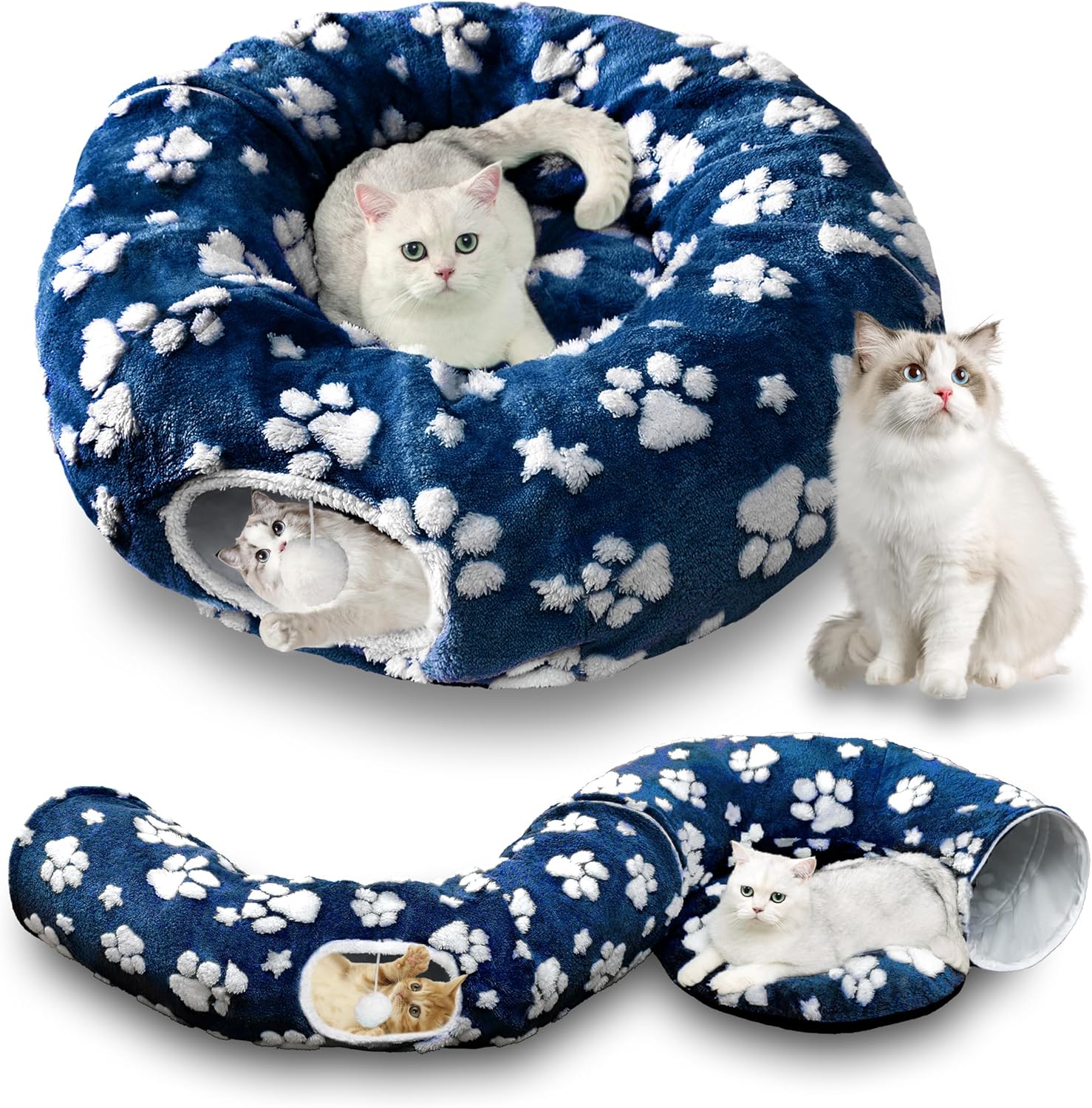 Cat Tunnel for Indoor Cats, Cute Peekaboo Cat Cave with Dangling Balls, Pet Donut Tunnel Bed with Circle Mat for Puppy Kitten Rabbit, Blue Paw