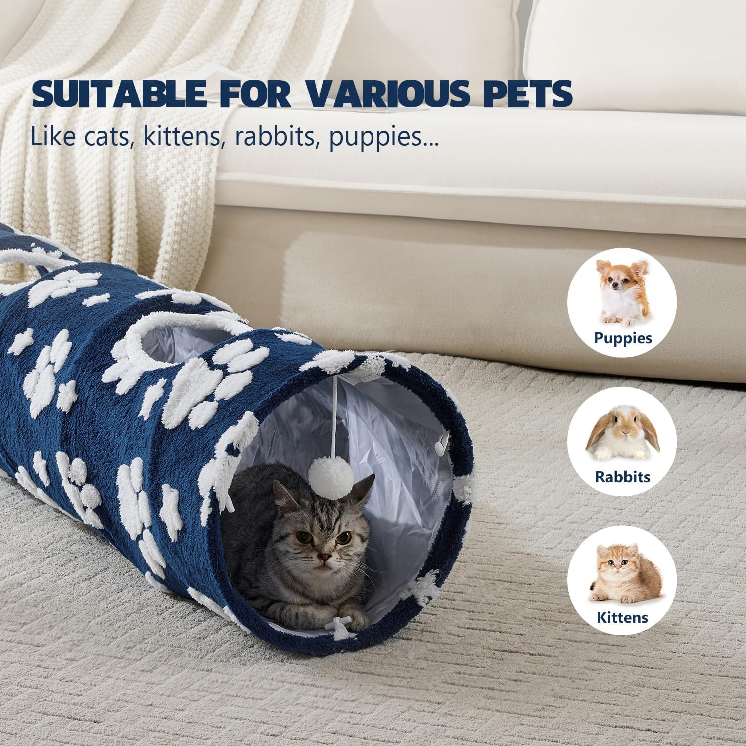 • Pet Play Paradise: Designed as a pet paradise, the tunnel challenges cats to sprint through its straight shape, leap out of peekaboo holes, or engage in endless hide-and-seek games. The spacious interior accommodates adult cats, kittens, and small pets like rabbits, turning playtime into a thrilling workout