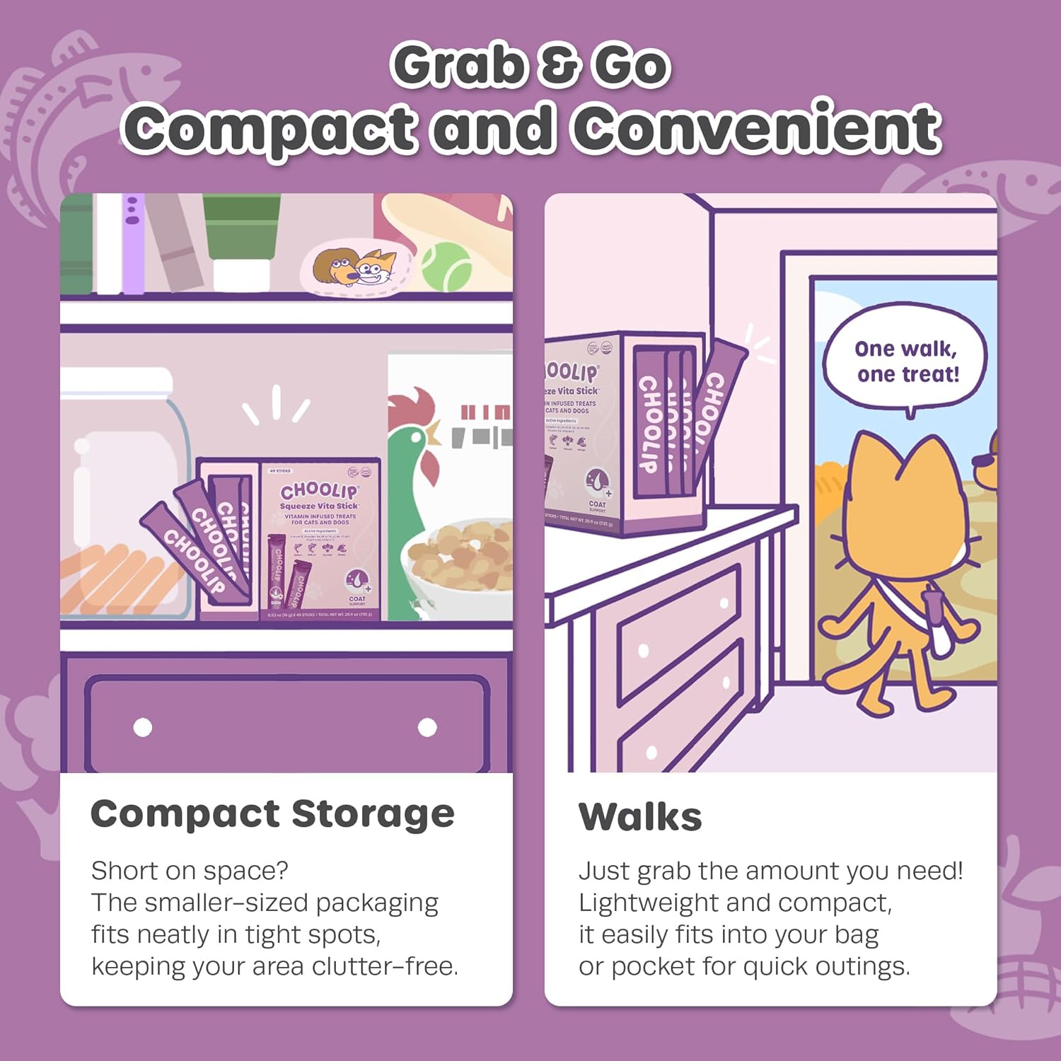 • COMPACT DISPENSER PACK: This Skin and Coat Support pack includes 49 sticks to treat your cat or dog. It’s perfect for quick, grab-and-go use, easy to carry in a bag for trips, or convenient to keep near your pet supplies.