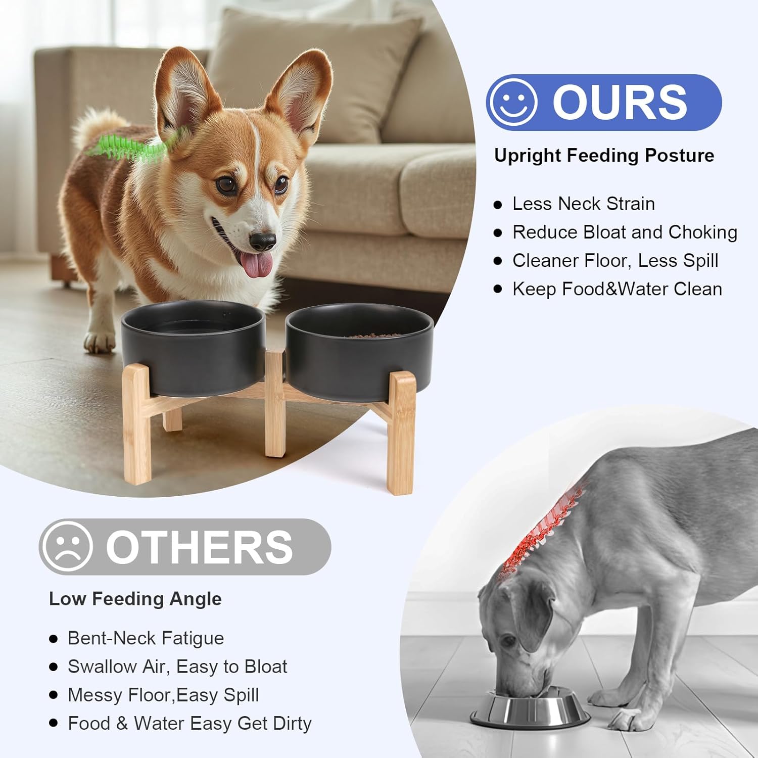 • Stable, Tip‑Resistant Design – A solid bamboo frame with Chew‑Resistant Heavyweight Ceramic, wide stance, and slip‑proof silicone pads join forces to create raised dog bowls that STAY IN PLACE on tile, wood, or laminate. Fewer spills mean cleaner floors and no accidental gouges or scratches or noisy