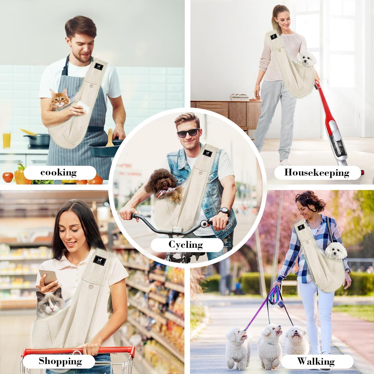 - Pressure-Relieving Comfort Design – PAWPUBBY dog carriers for small dogs features upgraded improvements. Compared to traditional dog slings, our puppy sling widens and thickens the shoulder straps, using mechanical design to evenly distribute pet weight, reducing shoulder and waist burden on the human body while alleviating shoulder fatigue. The soft inner lining mitigates vibrations during running or bumpy movements, protecting pet joints and reducing pressure on the spine and limbs.