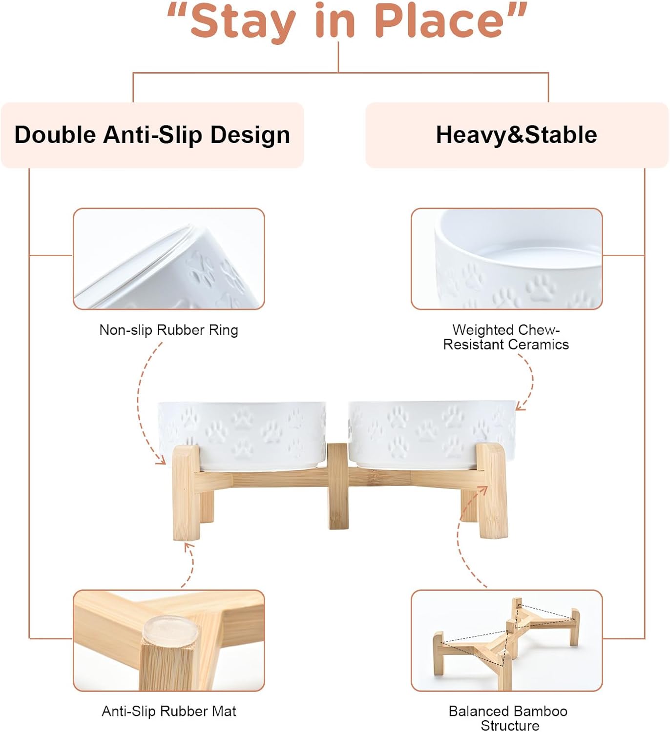 • Stable, Tip‑Resistant Design – A solid bamboo frame with Chew‑Resistant Heavyweight Ceramic, wide stance, and slip‑proof silicone pads join forces to create raised dog bowls that STAY IN PLACE on tile, wood, or laminate. Fewer spills mean cleaner floors and no accidental gouges or scratches or noisy