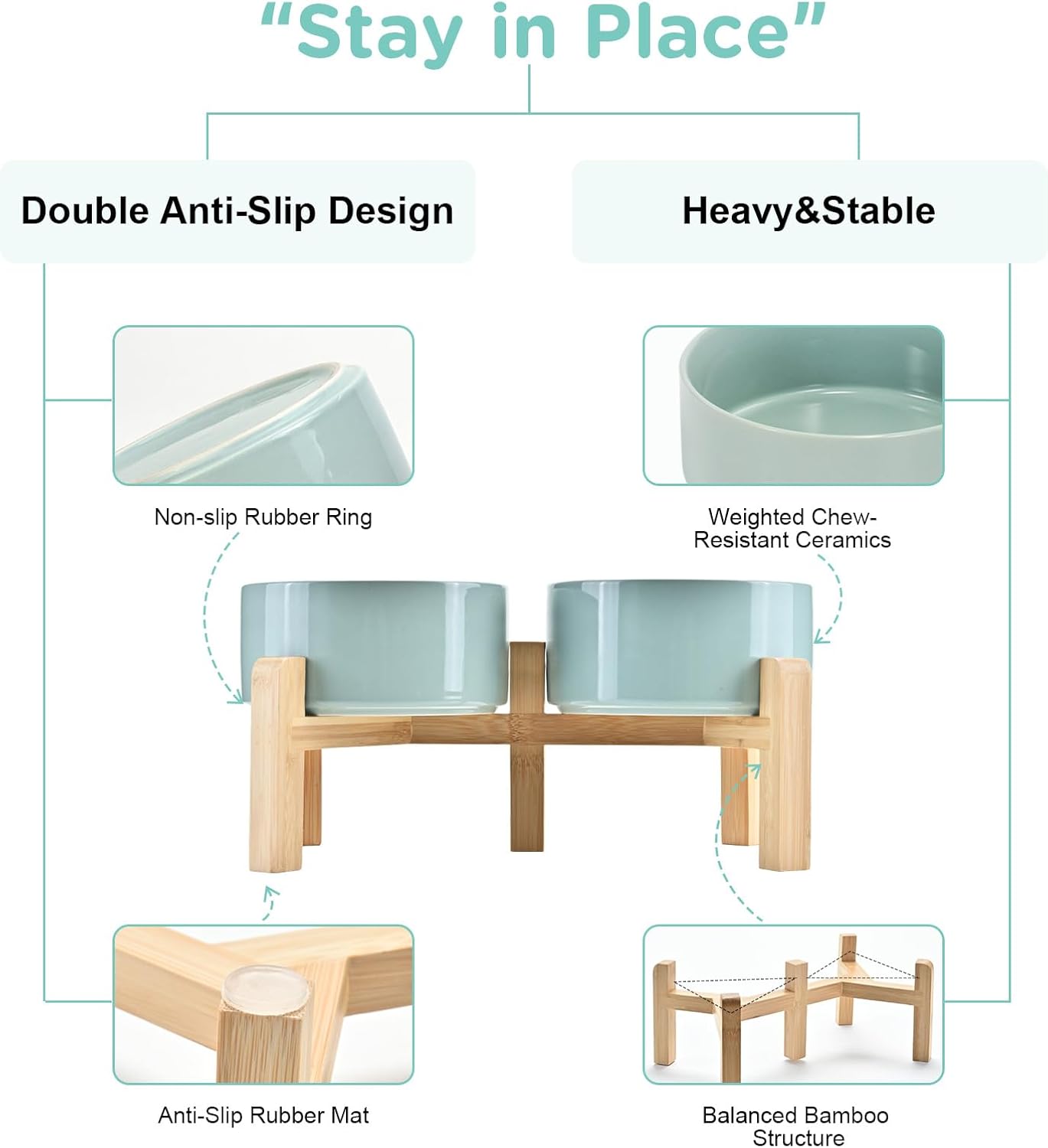 • Stable, Tip‑Resistant Design – A solid bamboo frame with Chew‑Resistant Heavyweight Ceramic, wide stance, and slip‑proof silicone pads join forces to create raised dog bowls that STAY IN PLACE on tile, wood, or laminate. Fewer spills mean cleaner floors and no accidental gouges or scratches or noisy