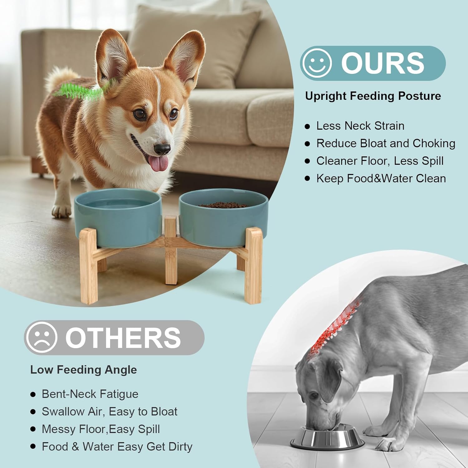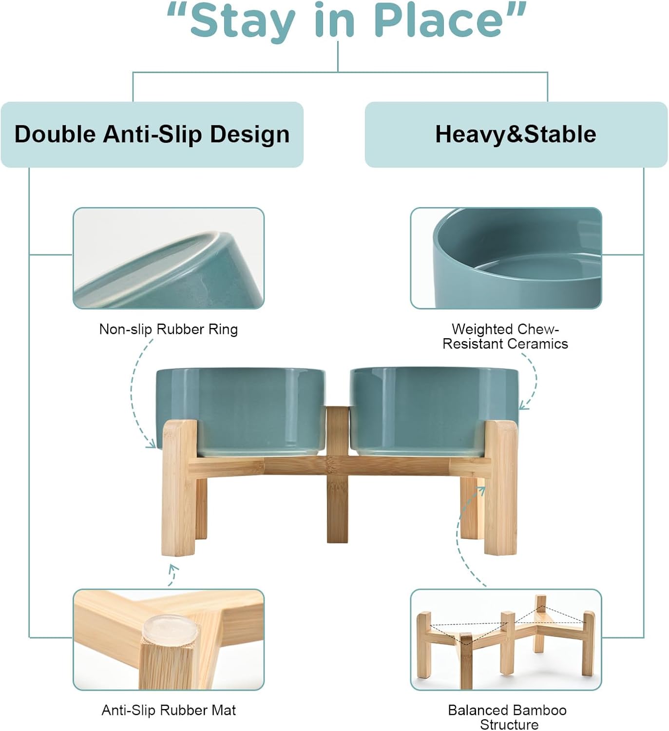 • Stable, Tip‑Resistant Design – A solid bamboo frame with Chew‑Resistant Heavyweight Ceramic, wide stance, and slip‑proof silicone pads join forces to create raised dog bowls that STAY IN PLACE on tile, wood, or laminate. Fewer spills mean cleaner floors and no accidental gouges or scratches or noisy