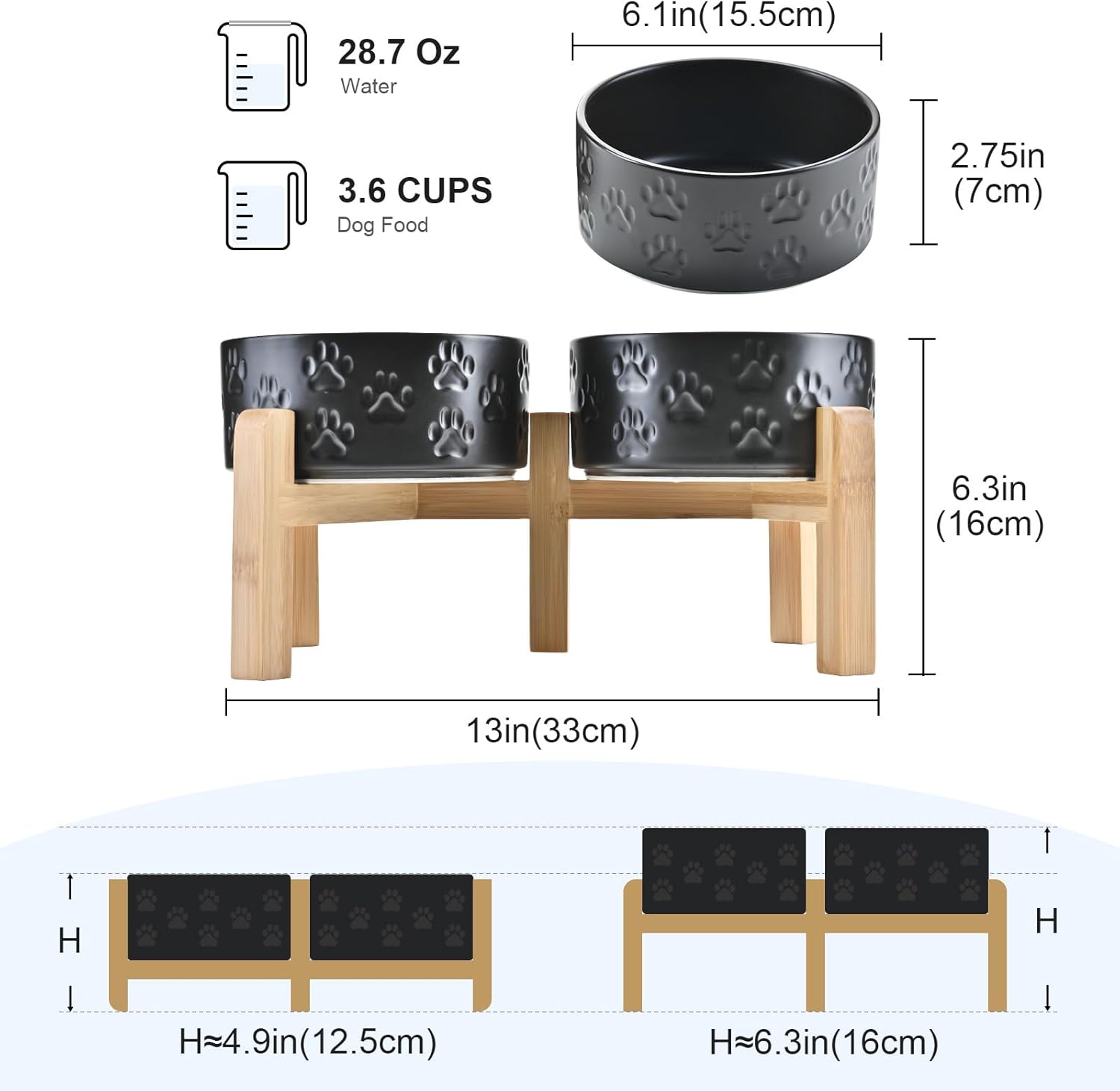SPUNKYJUNKY Elevated Dog Bowls Ceramic, 6.1'' Dogs and Cat Food Water Bowls Raised with Non-Slip Bamboo Stand for Medium Sized Breed Microwave Dishwasher Safe - 28.7 OZ,Paw Black