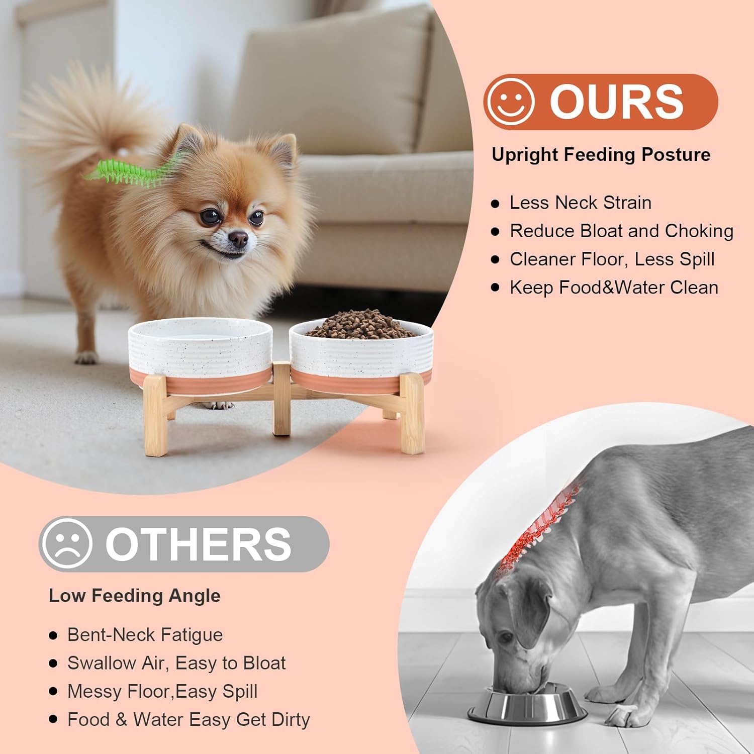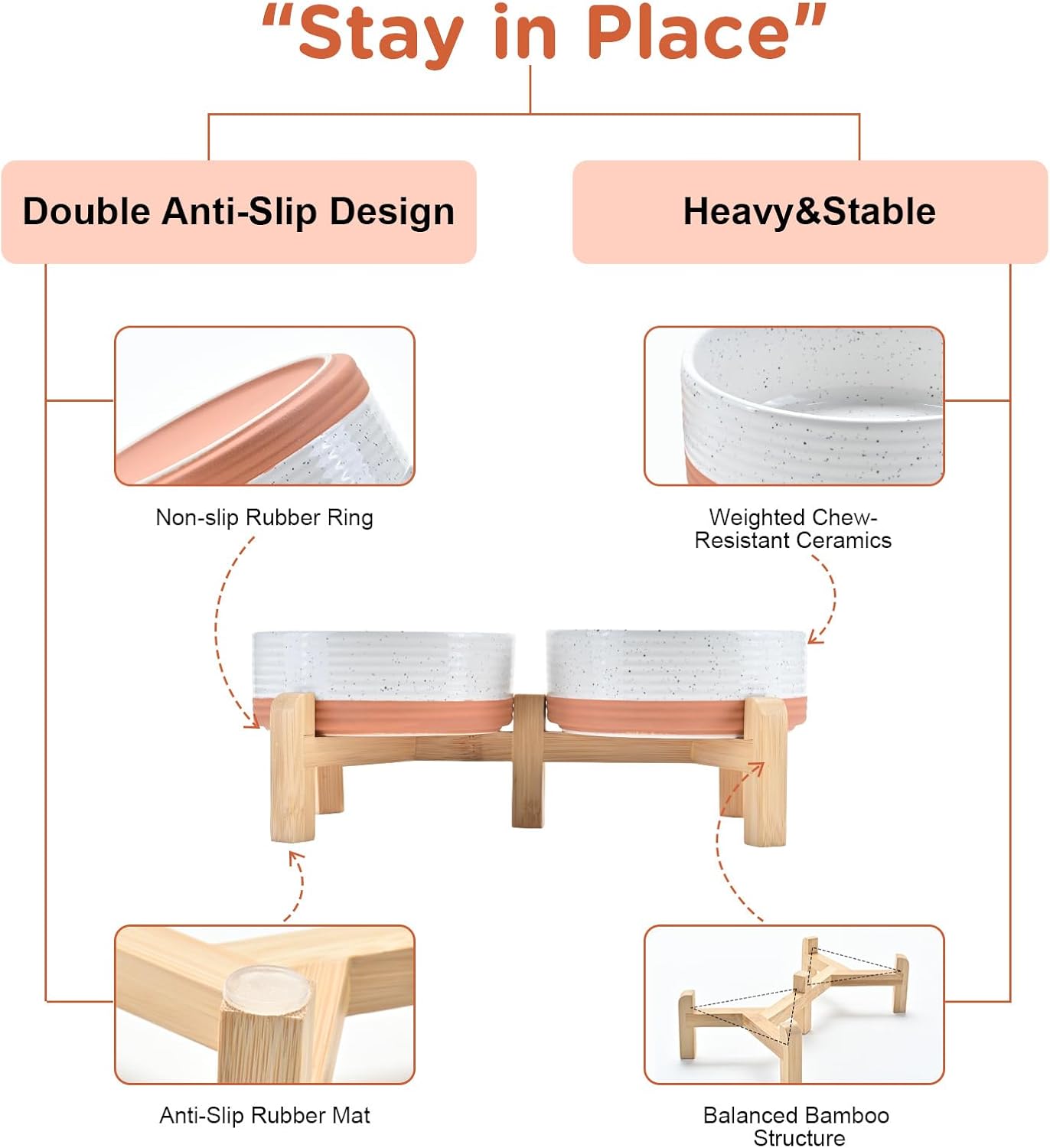 • Stable, Tip‑Resistant Design – A solid bamboo frame with Chew‑Resistant Heavyweight Ceramic, wide stance, and slip‑proof silicone pads join forces to create raised dog bowls that STAY IN PLACE on tile, wood, or laminate. Fewer spills mean cleaner floors and no accidental gouges or scratches or noisy