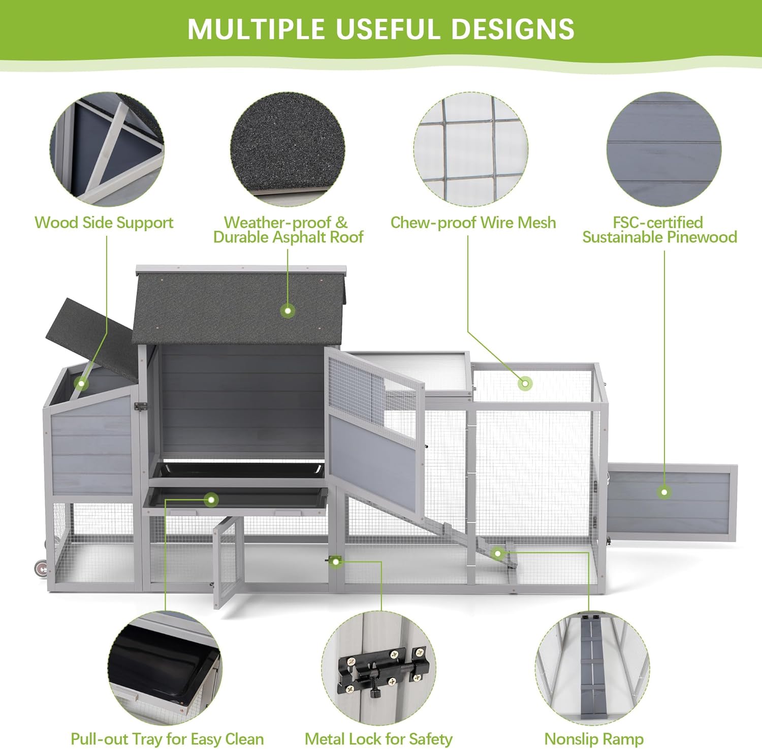 • 【Chicken Coop with Ample Space】: Measuring 82.29 inches in total length, this chicken coop provides chickens with a spacious living area and run area on the ride side for free roaming and exercise freely, suitable for 2 adult chickens or other similar sized pets.