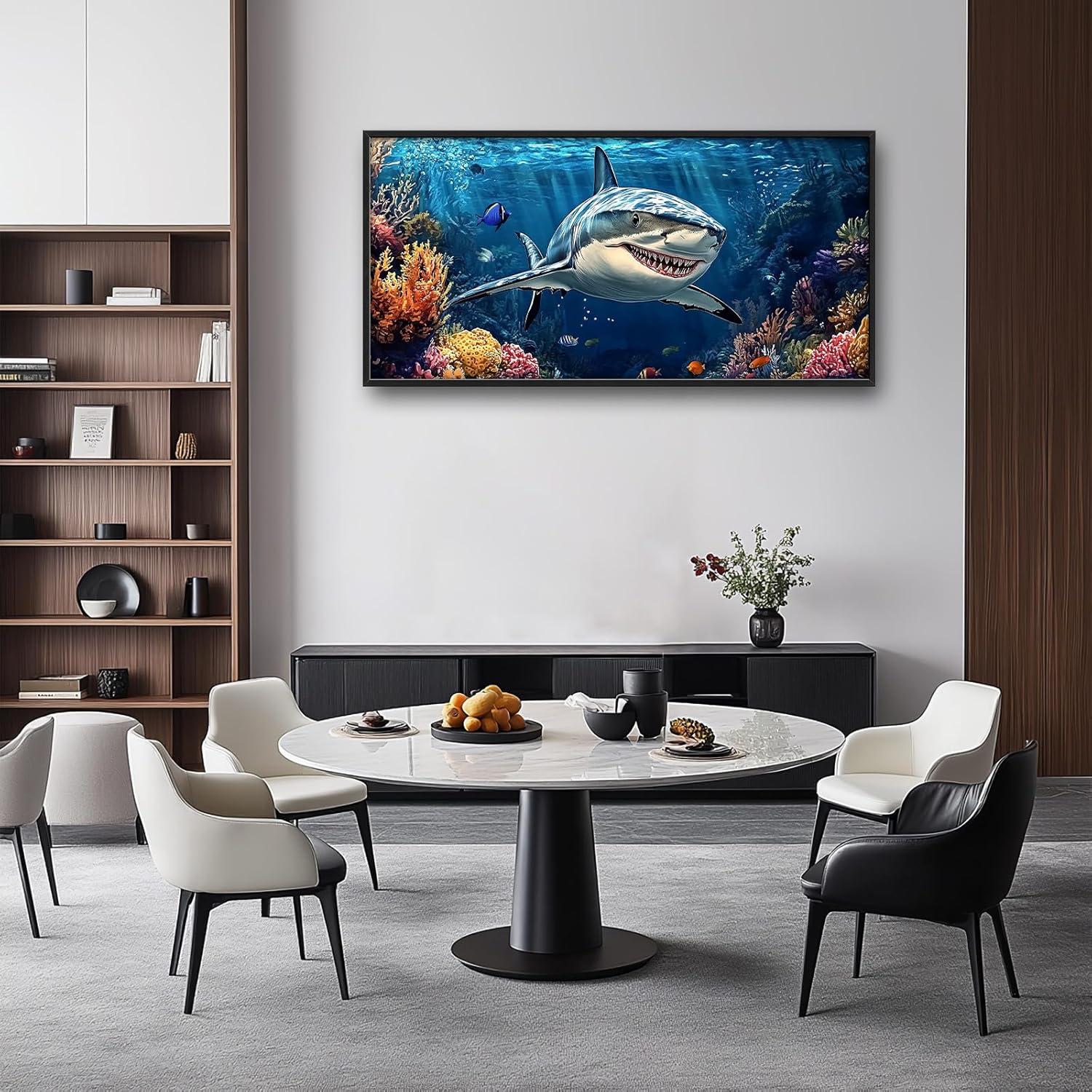 Large Ocean Shark Wall Art for Living Room, Framed Oversized Shark Fish Wall Decor Underwater Marine Life Canvas Painting Modern Artwork for Living Room Bathroom Bedroom Office Dining Room 60"x30"