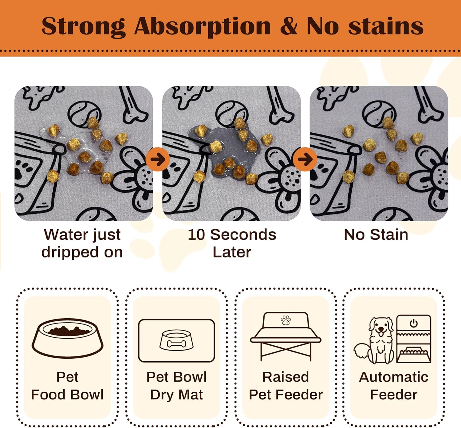 • Waterproof & Easy Clean Dog Food Mats for Floors Waterproof - Unlike regular mats, our heavy-duty dog food mat features a 100% waterproof layer that prevents liquids from seeping through the floor. Simply wipe clean your dog bowl mat after meals - no staining or odors! Works great as both a dog food mat and cat food mat.