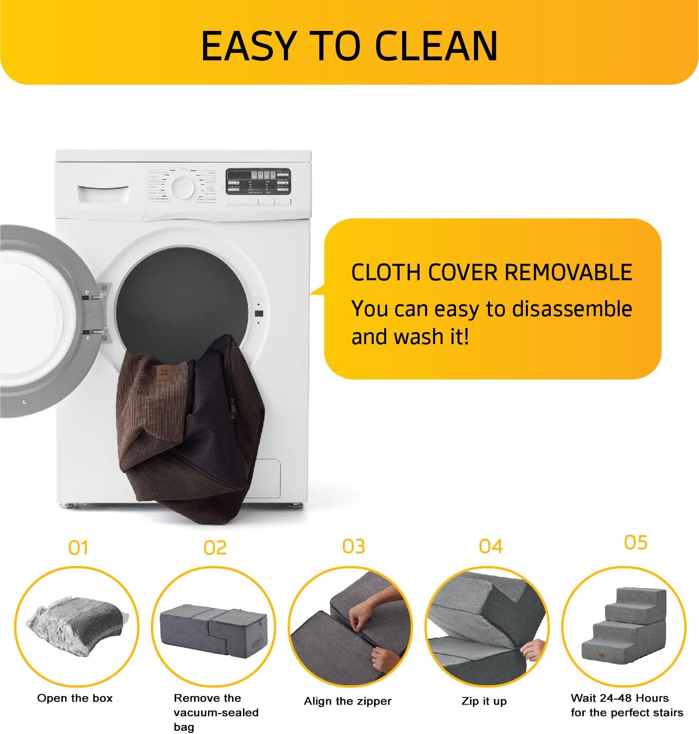 • 【Easy to Clean】: The dog stairs feature a removable, machine washable cover for effortless cleaning. Simply take out the foam core for washing; however, please avoid cleaning the foam and board. After removing from the compression bag, allow 24-48 hours for the foam to fully expand before use for optimal comfort