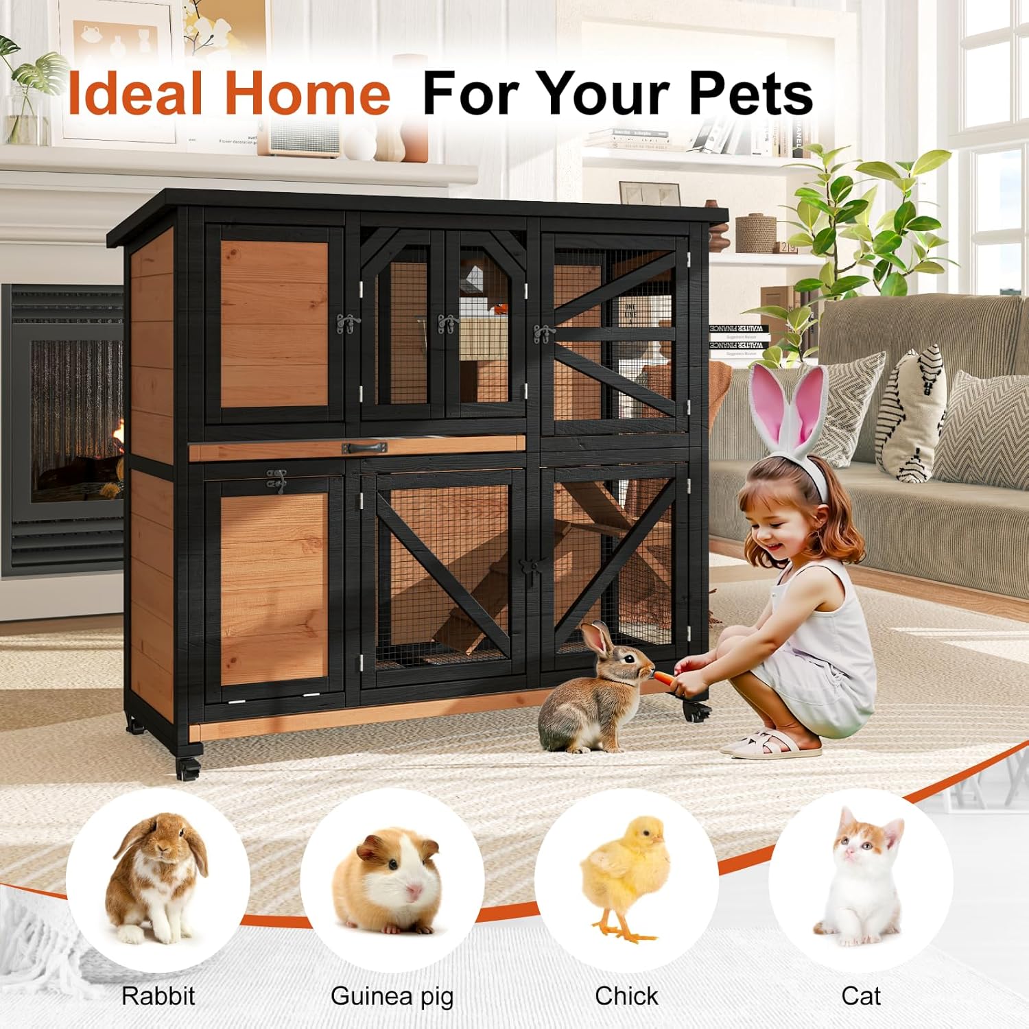 47.3" Two Story Rabbit Cage Bunny Cage Indoor, Wooden Rabbit Hutch Hamster Cages for Small Animals, Outdoor Guinea Pig Cages with Wheels & 2 Removable Trays & Bottom Wire Mesh