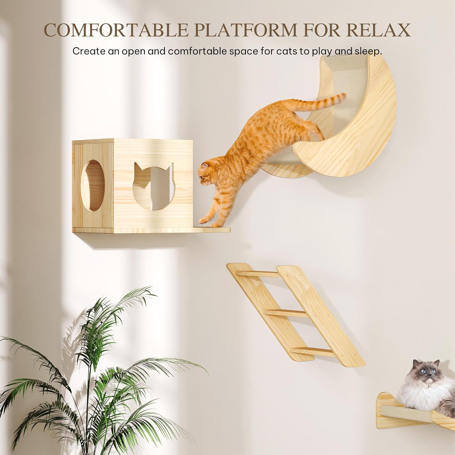 • Wall-Mounted Cat Furniture for Felines: Turn your wall into a cat's dream playground with stylish perches and houses that allow active kitties to climb, lounge, and explore to their heart's content, all while keeping your floor space open and organized.