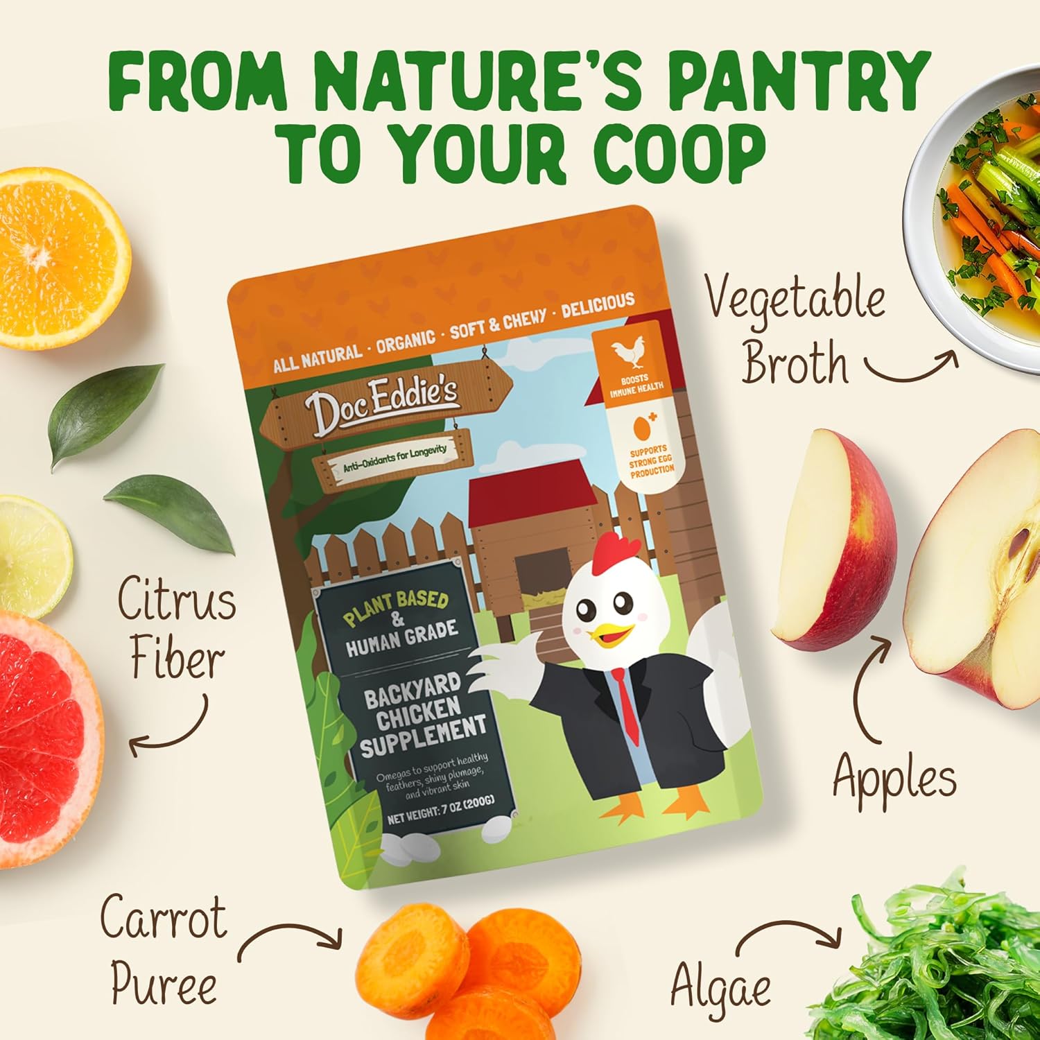 • Nature's Own Superfood - Doc Eddie’s Chicken Supplement is a human-grade, plant-based treat packed with essential omegas 3 & 6 that transform your backyard flock into vibrant egg-laying hens with glossy feathers and exceptional health without artificial additives.