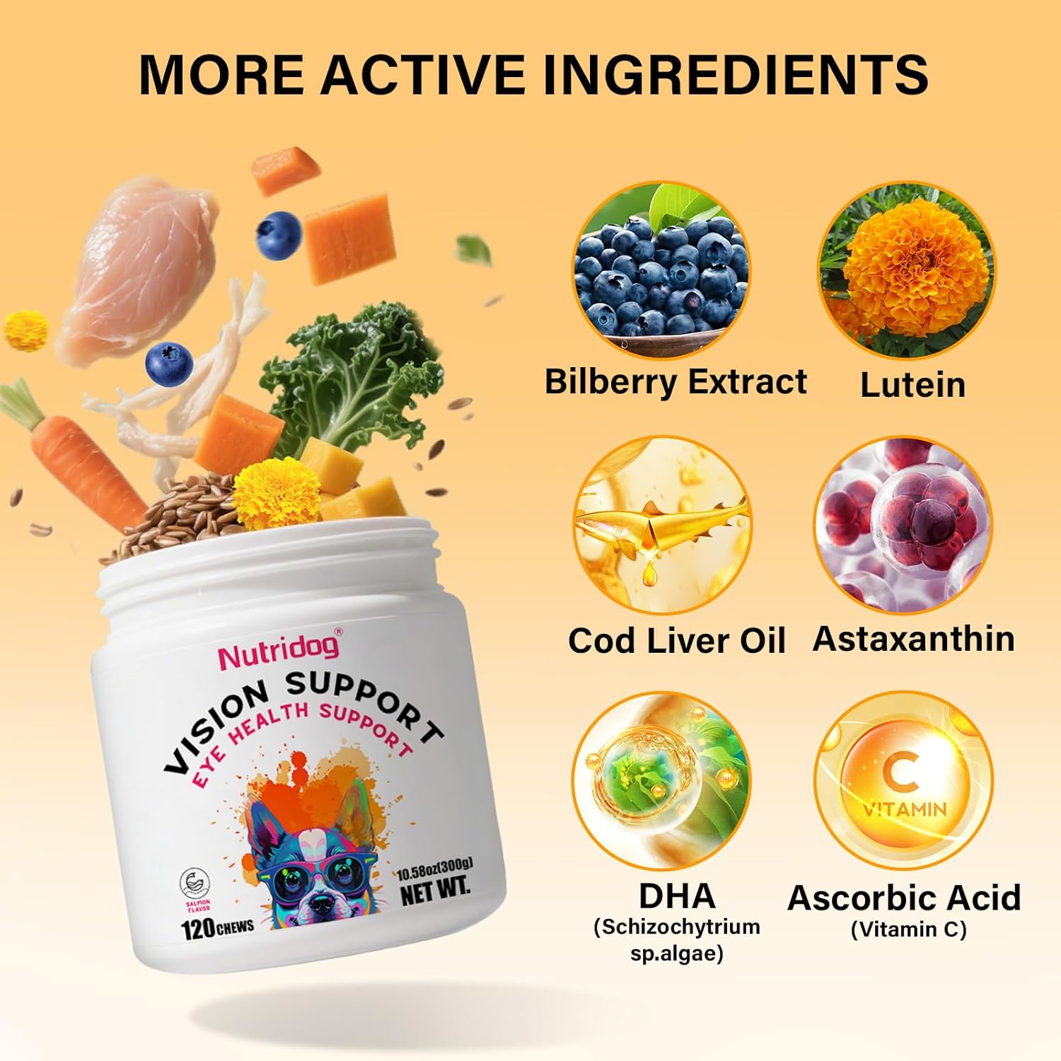 • ADVANCED EYE HEALTH FORMULA WITH COD LIVER OIL & ANTIOXIDANTS - Nutridog Eye Supplements deliver 12 essential nutrients including DHA from algae, Bilberry Extract, and Lutein to combat oxidative stress and reduce inflammation. Scientifically formulated to support retinal function and shield against UV damage, these soft chews target cataracts, dry eyes, and conjunctivitis while promoting long-term ocular resilience. Ideal for aging dogs or breeds prone to vision decline
