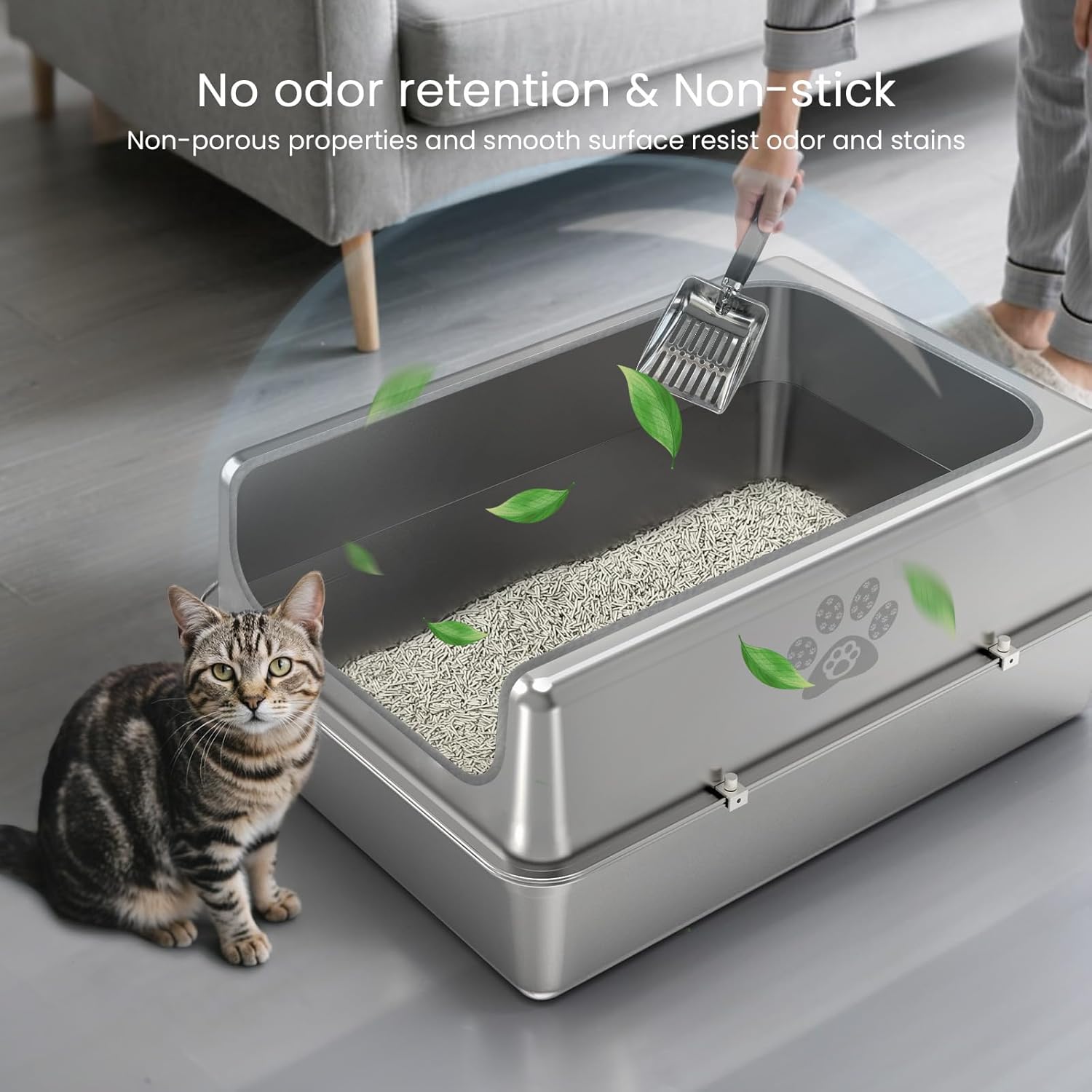• Doesn't Absorb Odor & Easy to Clean --- The open top stainless steel cat litter box material characteristics will not collect any residue or odor, and the non-stick surface makes cleaning very easy, just a quick rinse and wipe with water to complete the cleaning easily. So if you don't like the characteristics of plastic litter boxes that will retain odor and want an easy way to clean, this stainless steel litter box is a great choice for you!