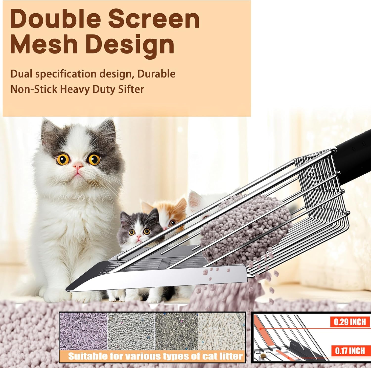 • 2. Efficient Double-Layer Sieve for Quick Filtration: This cat litter scooper features a dual-layer design with large and fine holes, effortlessly separating clumps from various types of litter (bentonite, silica, or crystal and so on). The angled design reduces the need for repeated shaking, minimizes scooping repetitions, and reduces dust, allowing for quick and hygienic cleaning with this litter box scooper