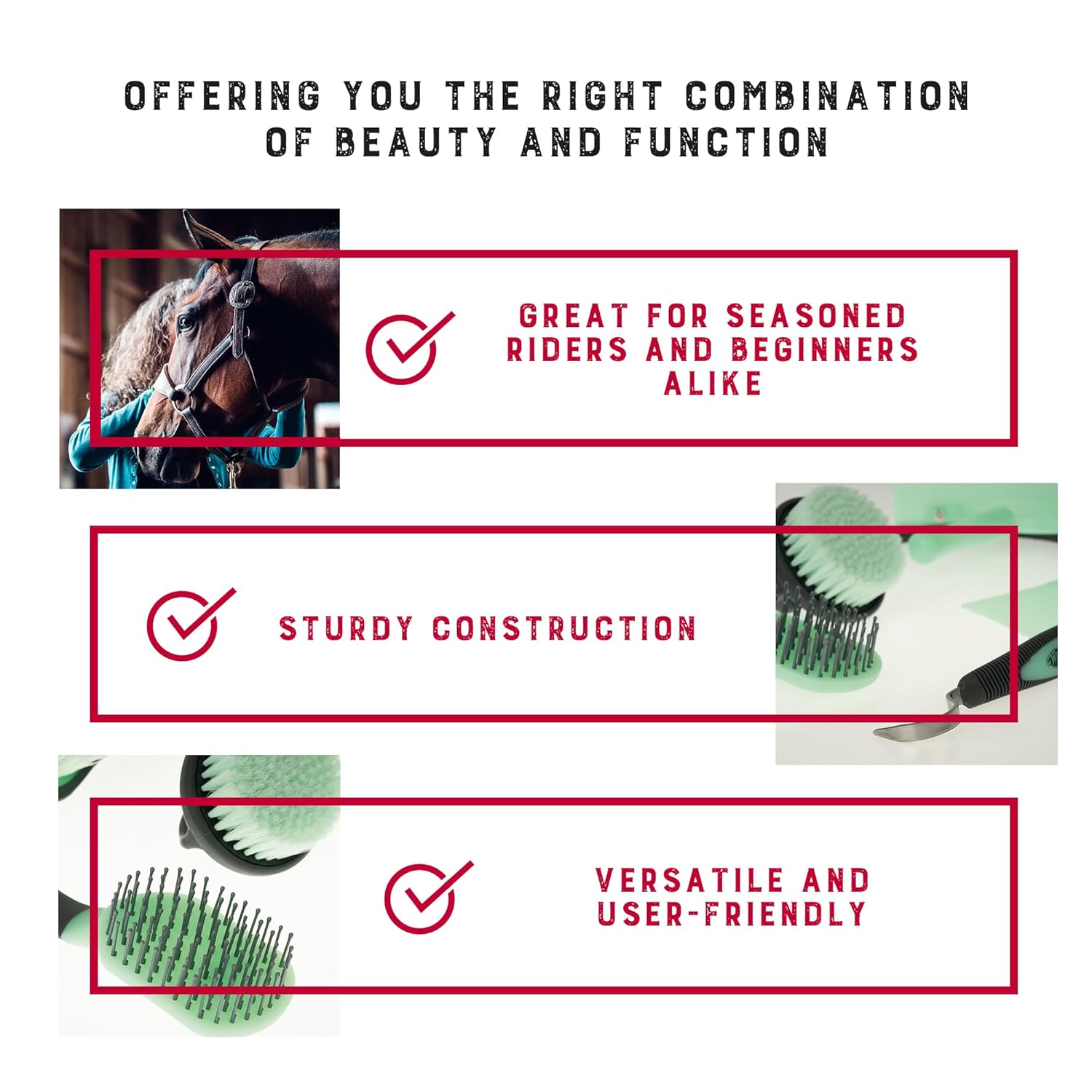 • Horse Grooming Kit: Ensure effortless cleaning and grooming of your horses with our horse grooming set; these 6-piece horse essentials include a comb, hoof pick, palm-held brush, mane and tail brush, dandy brush, and sweat scraper/coarse curry combo