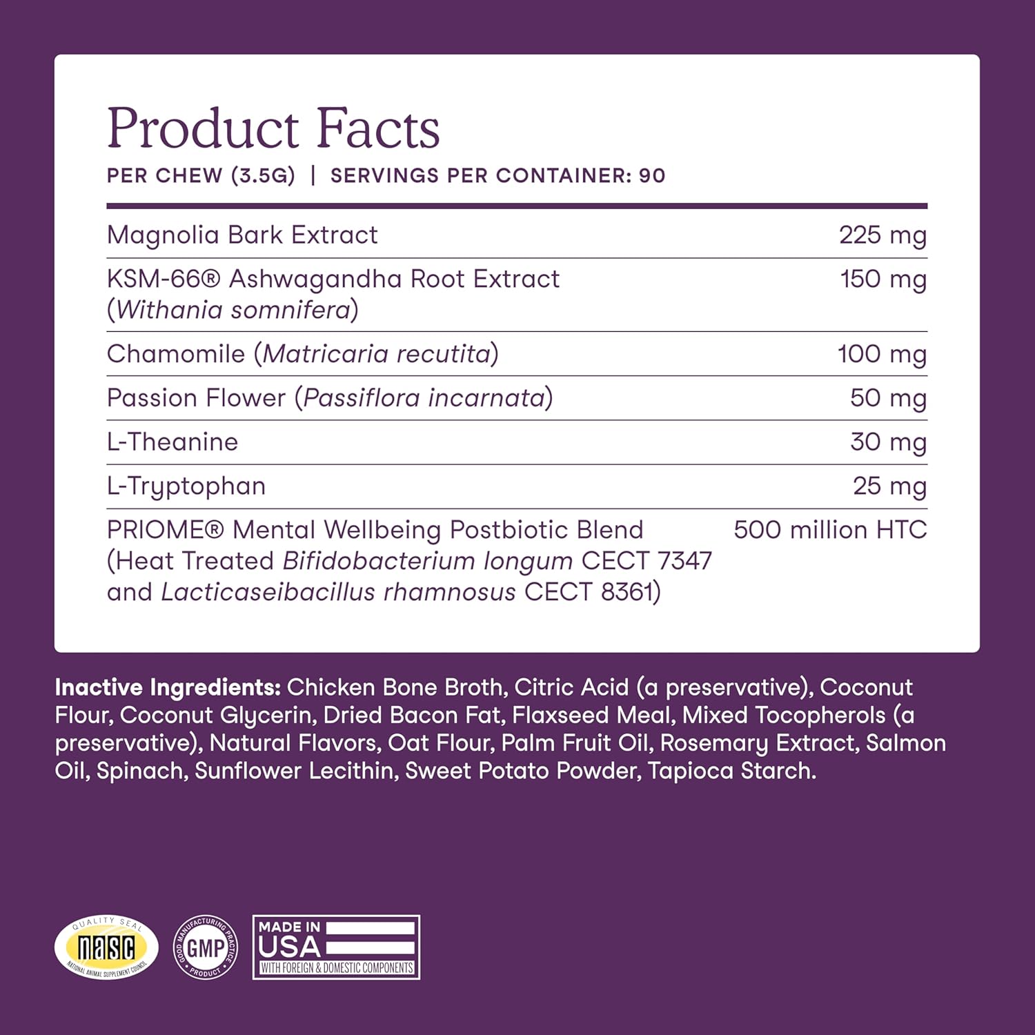 • Premium Traceable Ingredients That Go Beyond the Basics: Our dog calming chews are made with KSM-66 ashwagandha, magnolia bark, chamomile, passionflower, L-theanine, and L-tryptophan; no artificial preservatives, fillers, or dyes