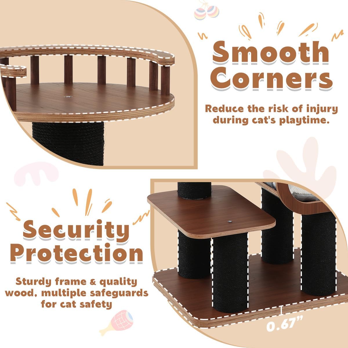• 【Pet-friendly Material】Our cat tree crafted from superior walnut wood that combines luxury with stability. The top platform features a protection bar that reduces injury risk by preventing falls. This cat furniture is designed to provide a safe, sturdy, and entertaining home for your kittens.