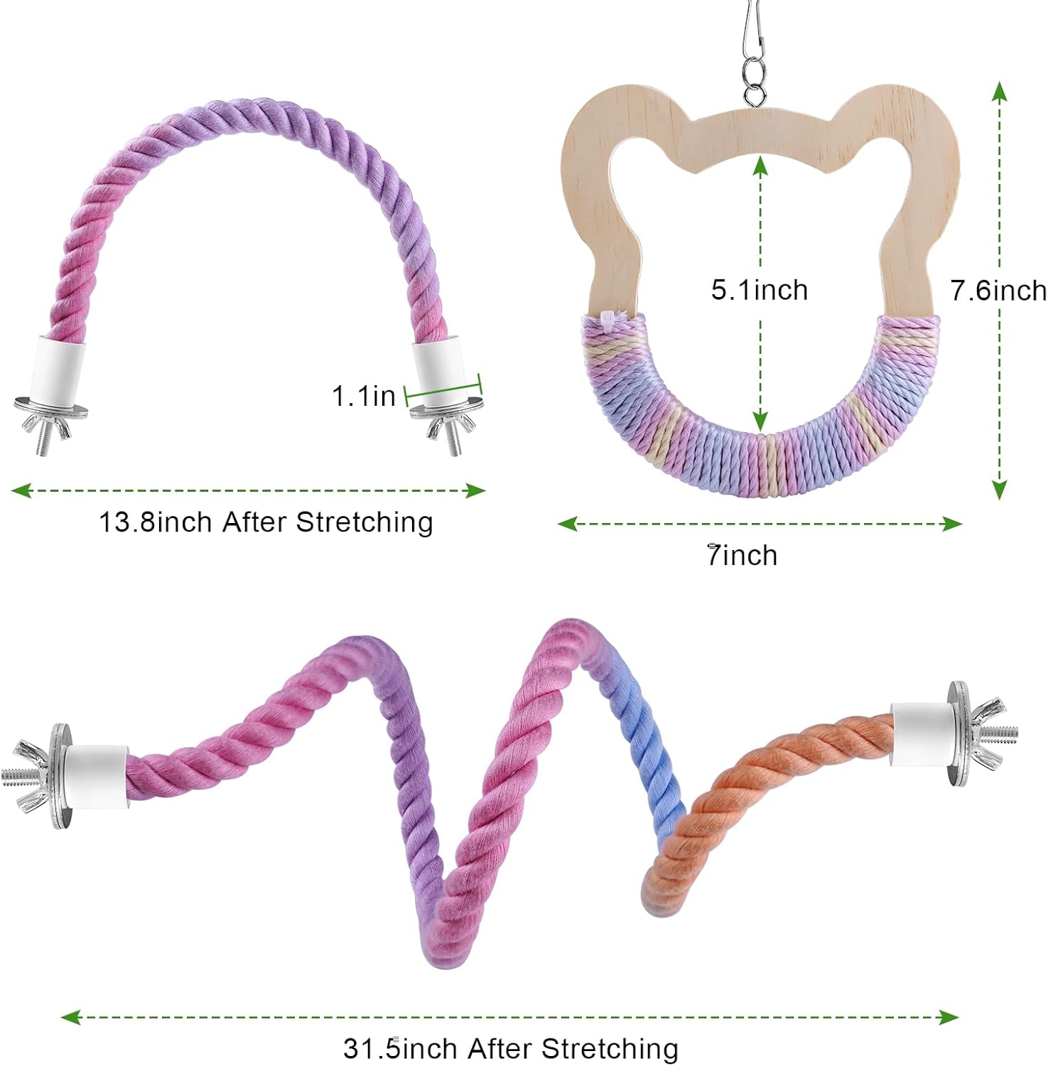 • OPTIMISED SIZE: Includes a 13.8 inch and a 31.5 inch bird rope perch that flexes. There is also a wooden bird swing. Fits any cage shape, creates multi-level play area for climbing, resting and exploring, reduces territorial conflicts between birds