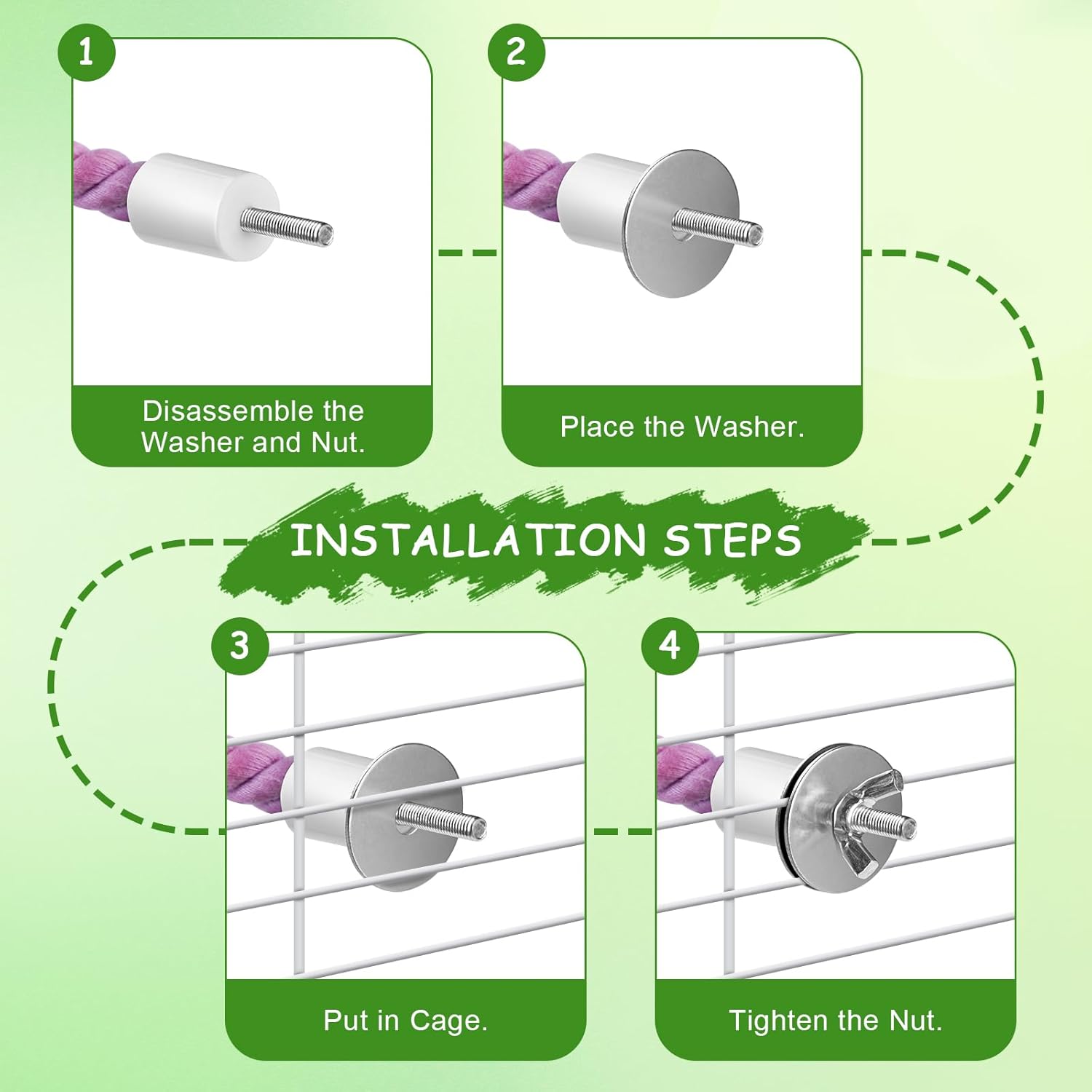 • QUICK INSTALLATION: Tool-Free installation! Includes metal screws to attach tightly to the bird cage in seconds, sturdy iron connectors and thickened bird ropes support to withstand small to medium sized birds, ensuring stability during game play