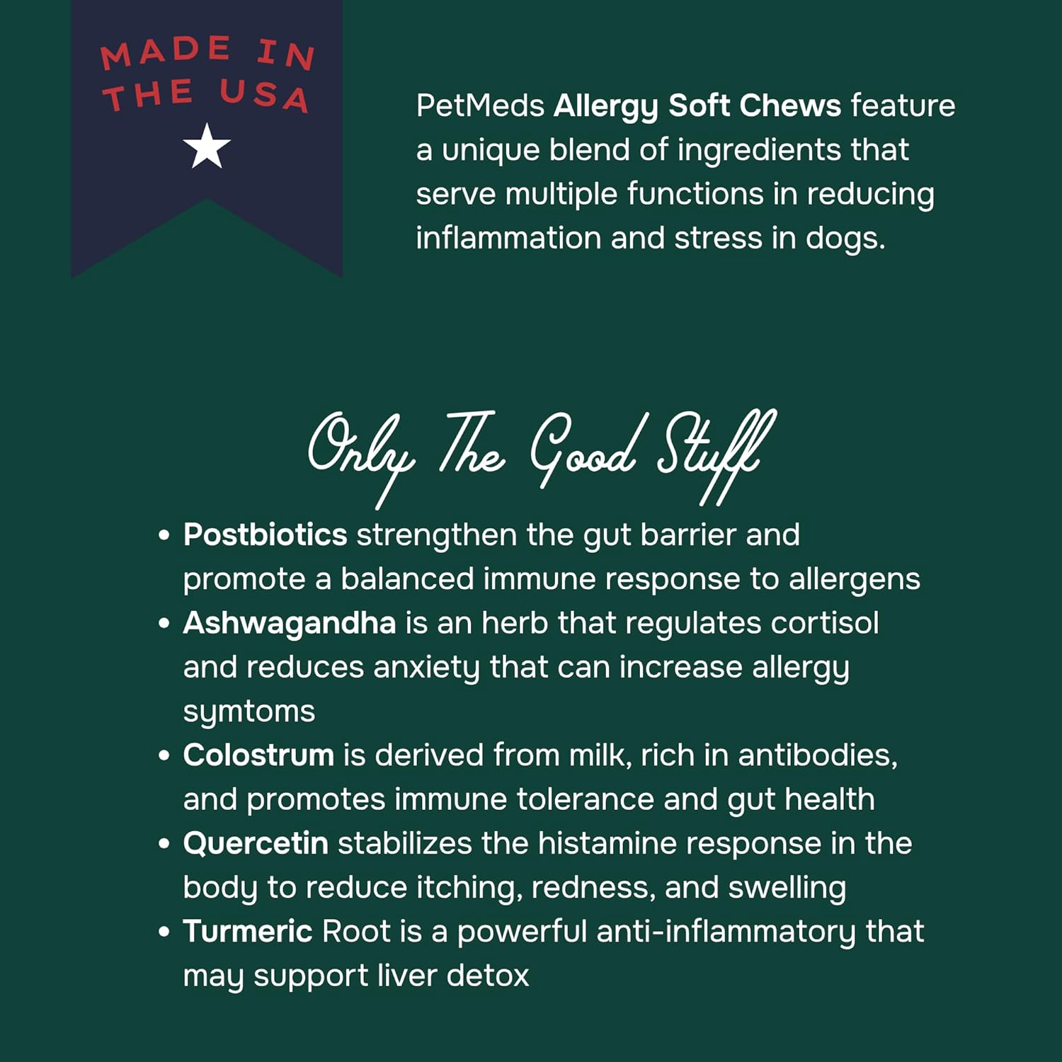 • Vet-Formulated & Made in the USA – Expertly crafted with high-quality ingredients, PetMeds Allergy Chews are made in the USA to ensure safety and effectiveness you can trust.