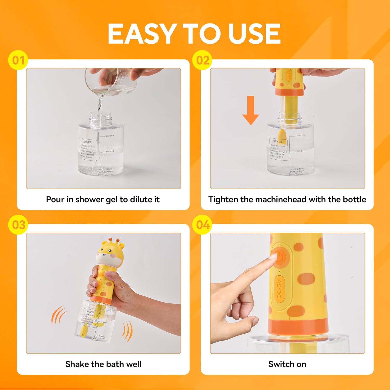 • 1.1-Second Foam Magic - No Mixing, No Mess! Simply add shampoo + water (follow bottle markings), shake gently, and press the button - our system instantly generates rich, spa-grade foam for deep cleaning. The included bath glove boosts scrubbing power while being gentle on skin.
