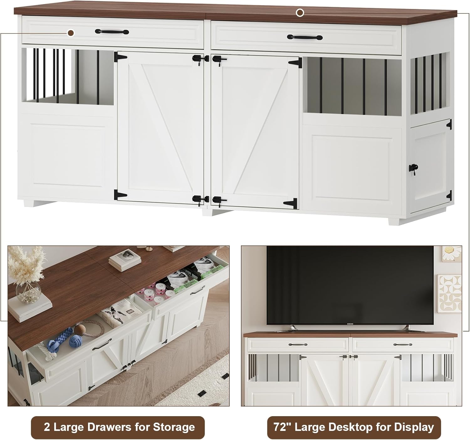 Dog Crate Furniture - Indoor Wood Dog Kennel Furniture 4 Doors with Divider and 2 Drawers - 72" L x 23.6" W x 33.5" H, White