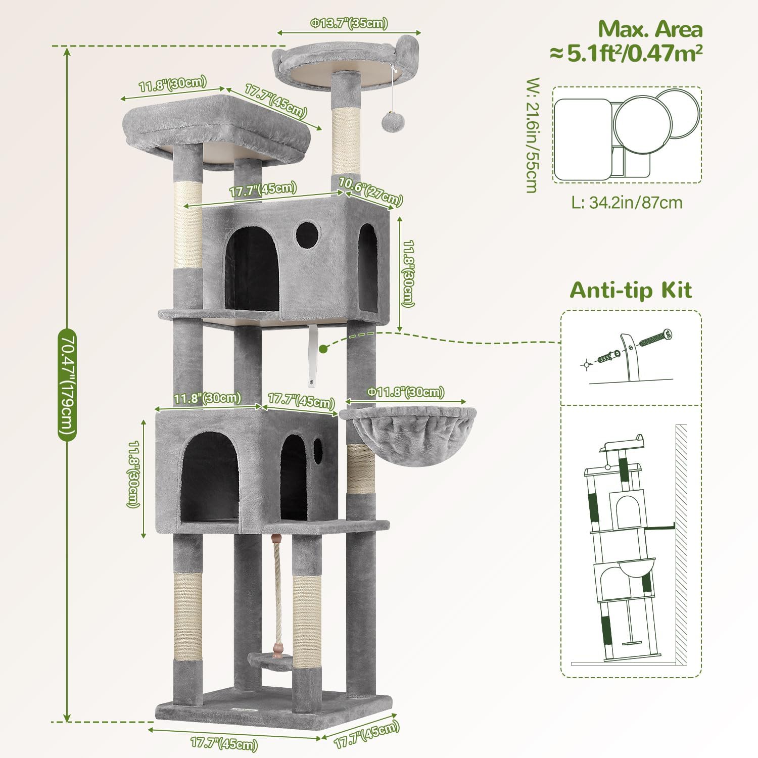 • HEIGHT: Standing at 70 inches tall, this cat tree offers ample space for climbing, meet your cat's needs for climbing, observing, and playing. Allow your cat to explore at different heights, keeping them active and curious